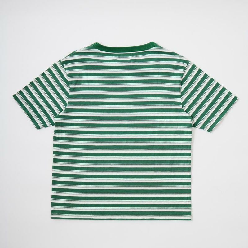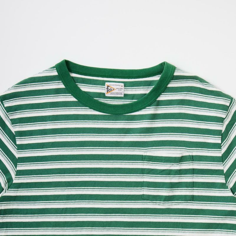 FELCO(フェルコ)のS/S BINDER CREW NECK STRIPE POCKET TEE AMERICAN DRY JERSEY STRIPE2。ストライプ柄のコットン素材を使用したクルーネックの半袖Tシャツ。しっかりとしたバインダーネックの襟元や胸のポケット、リブなしの袖口が特徴的なディテール。アメリカブランドらしい身幅には程良いゆとりがあり、着丈がやや短めとなるボックスシルエットのTシャツ。単体でもインナーとしても活躍してくれる丁度良いウエイトのコットン素材。ストライプ柄がシンプルなスタイリングのアクセントになってくれる1着です。
