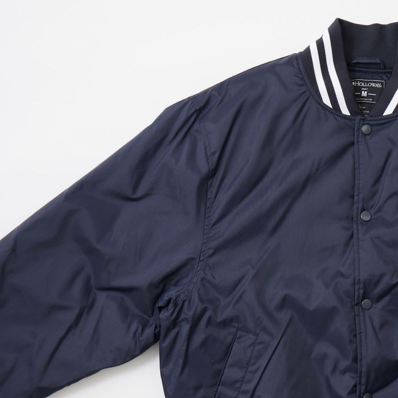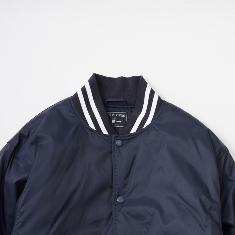 HOLLOWAY (ホロウェイ)のHERITAGE。光沢の少ないナイロンキャンパス素材を使用したアワードジャケット。襟周り、袖口、裾部分は2本ライン入りのリブニット仕様。前立て部分はスナップボタン仕様。腰部分にはスラッシュポケットを装備。内側には保温性に優れた起毛素材を採用。裏地はキルティングが装備されており秋から春にかけて3シーズン着用して頂けます。腕周りは身頃と同じく太めのつくりからゆったりとした軽くて着心地の良い1着です。