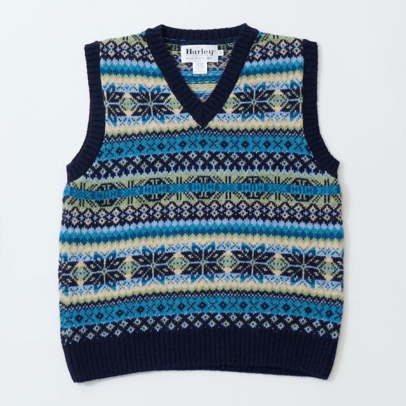 HARLEY OF SCOTLAND(ハーレーオブスコットランド)のALL OVER FAIRISLE SLIPOVER 100% PURE NEW WOOL。Vネックのフェアアイルベスト。スコットランド・シェットランド諸島産の上質なウール素材を使用。鮮やかな幾何学模様に編み立てたミドルゲージのフェアアイルニット。 ナチュラルな柔らかい風合い、軽くて暖かい着心地が特徴的なベストです。アウター、インナーどちらでも対応可能。スタイリングのアクセントとして取り入れやすいオススメの1着です。
