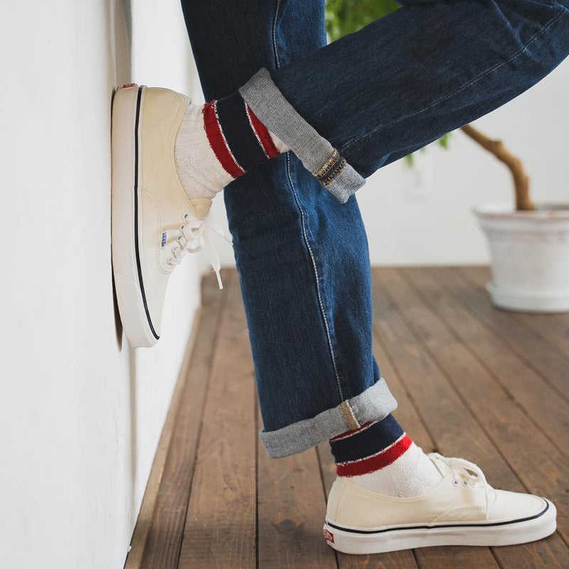 足の実寸は25センチぐらいです。こちらのソックスは問題なく穿けます。革靴、スニーカー、サンダルといった様々なアイテムとの相性抜群のネイビールーツのソックス。品質の高さ、穿き心地の良さは勿論のこと、丁寧に作られていることで長く穿いて頂けます。少し厚めのリブソックスですが、しっかりとしたホールド感がお気に入り。カジュアルから小綺麗なスタイルにも合わせ易い1足です。