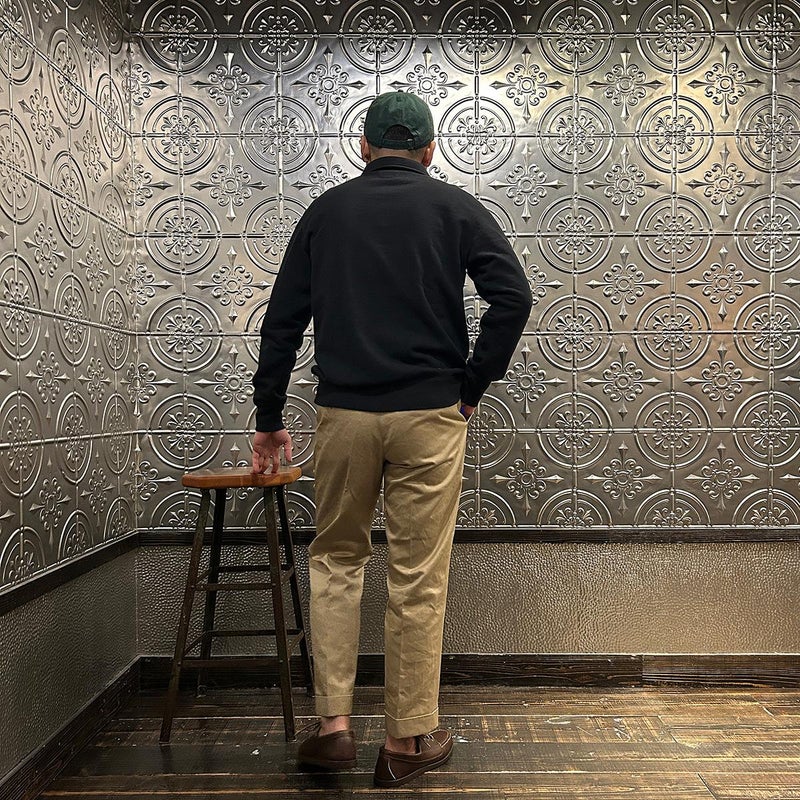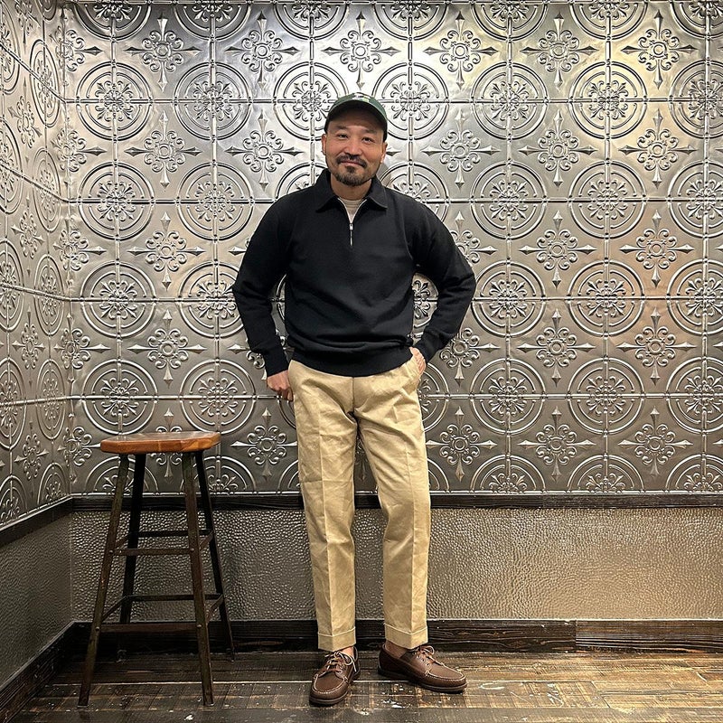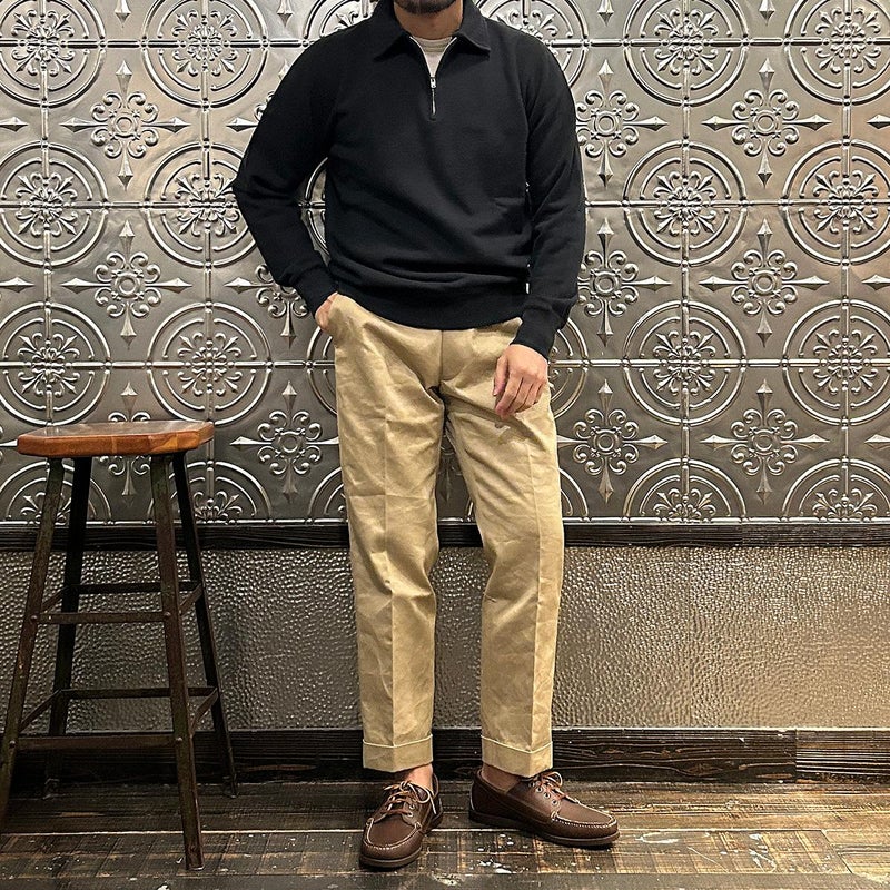 FELCO(フェルコ)の10oz LT WEIGHT FRENCH TERRY L/S HALF ZIP COLLARED SWEAT。10オンスのフレンチテリー(裏起毛していないスウェット生地)素材を使用したセットインスリーブのハーフジップのスウェットシャツ。40-50年代に多く見られるハーフジップの襟付きタイプのスウェットを現代風にモディファイ。袖口、裾はヴィンテージライクな長めのリブ仕様。肩や脇部分はフラットシーム仕上げ。特に襟周りのフィッティング、襟の立ち上がりや上着を着た時の襟の収まりに拘った一枚