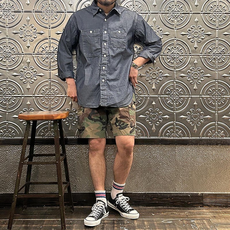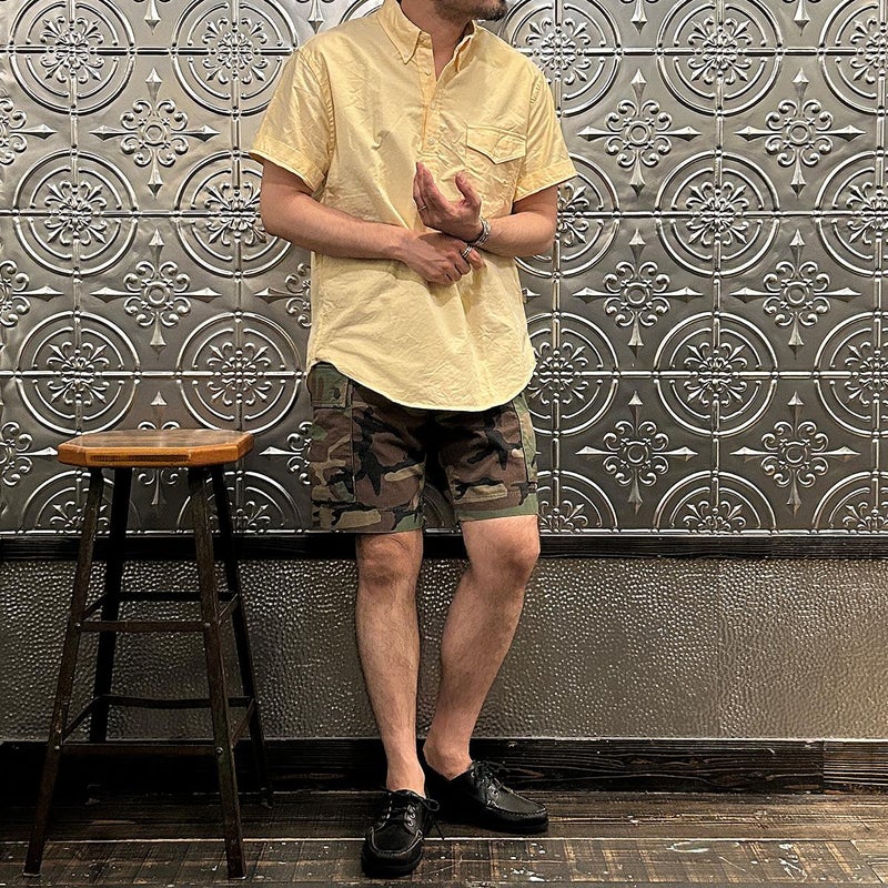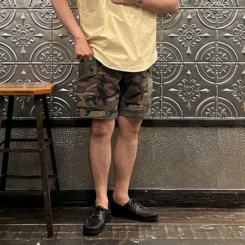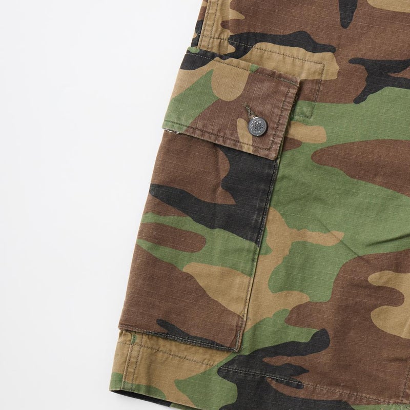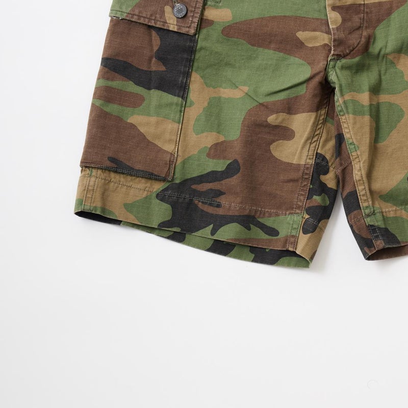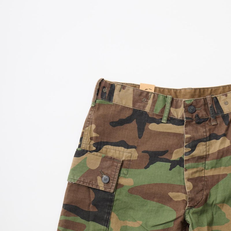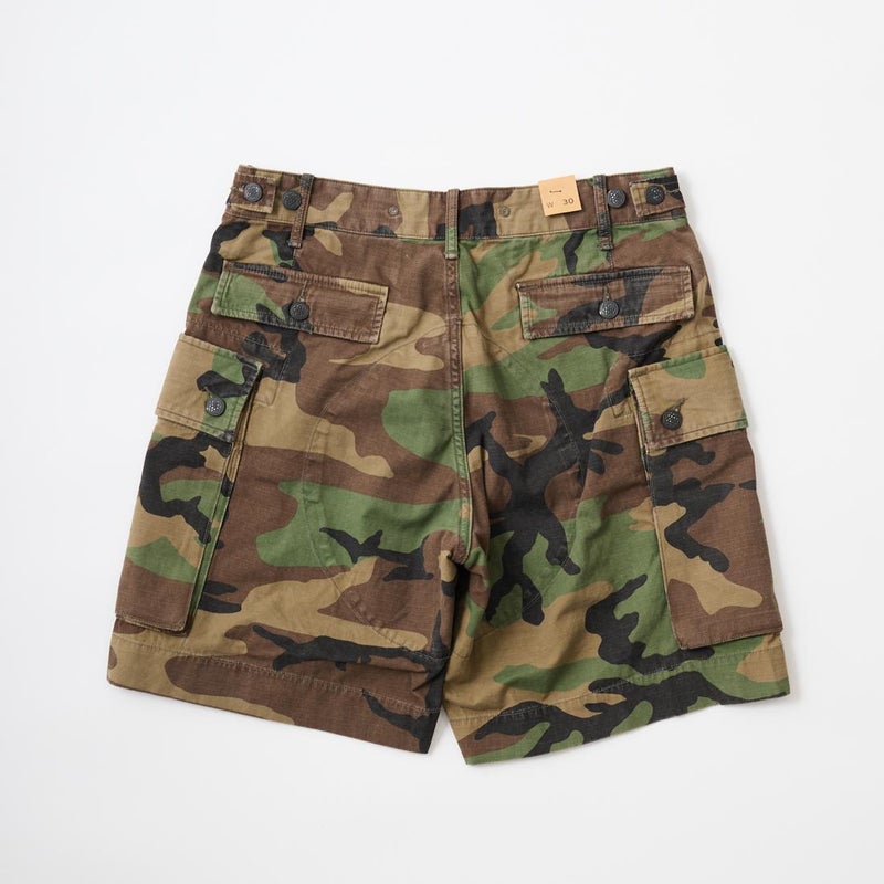 Double RL(ダブル アール エル)のREG CARGO SH CARGO COTTON RIPSTOP。カモフラージュ柄の6.1オンスのコットンリップストップをを使用したカーゴーショーツ。太すぎず、細すぎない絶妙なスタンダードライズのレギュラーフィットのショーツ。両太ももに手を両側から入れられるカーゴポケットを装備。腰回りにはベルトループ、サイドアジャスターが装備されており様々なスタイリングを楽しんで頂けます。リップストップ素材にストーンウォッシュ加工が施されており既にDouble RL(ダブル アール エル)らしいユーズド感は出ていますが更なる経年変化も楽しんで頂ける永く愛用して頂ける1本です。