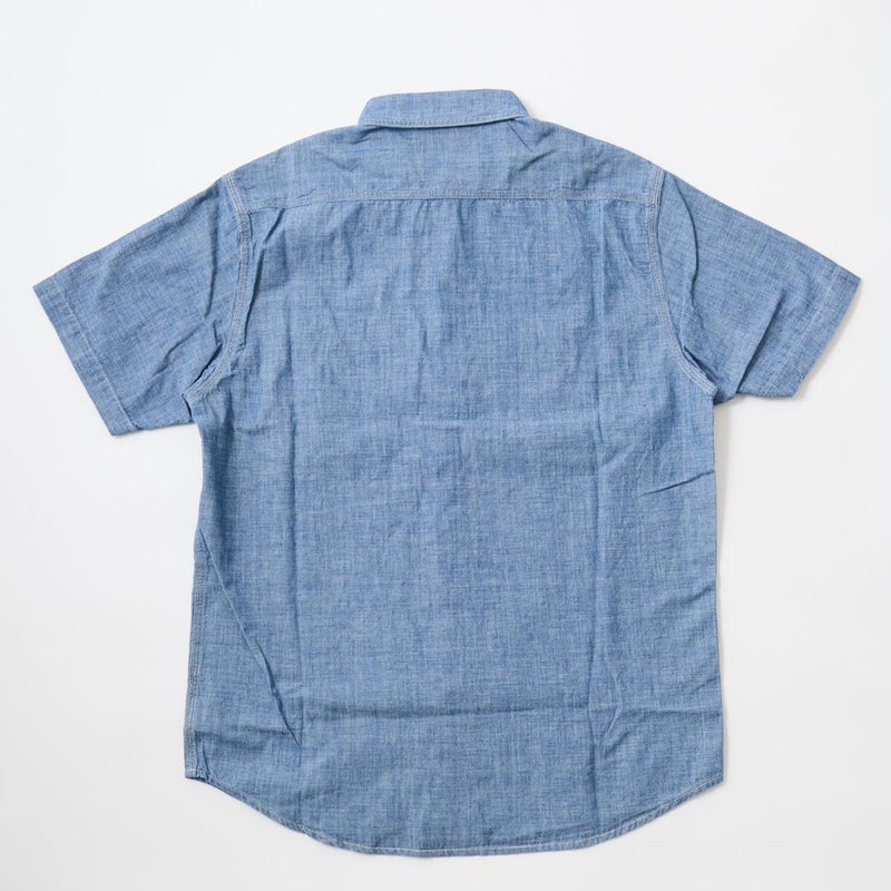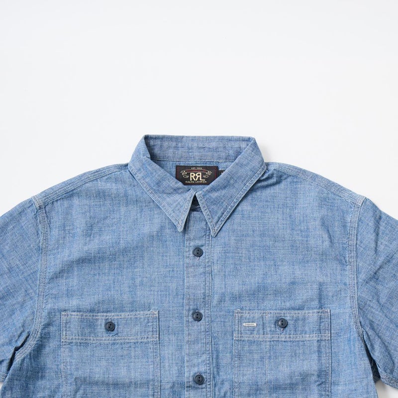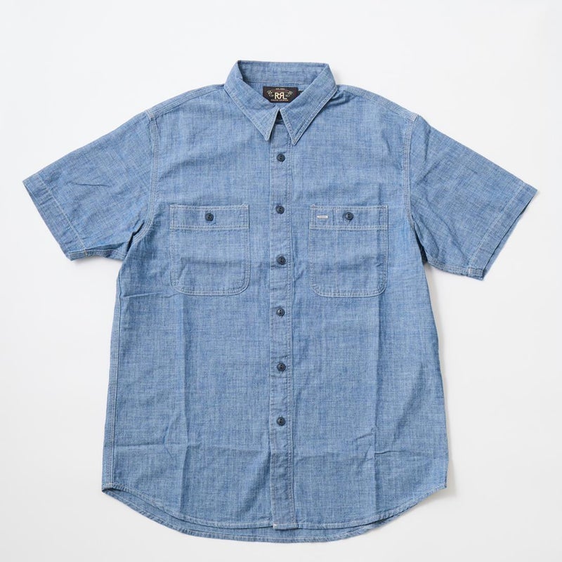 Double RL(ダブルアールエル)のCRAFTSMAN WS SHORT SLEEVE SPORT SHIRT CTN CHAMBRAY。日本製コットンシャンブレーを使用した半袖のワークシャツ。ポインテッドカラーや左右に配置されたワークシャツらしい大き目のボタン付きのパッチポケットが特徴的なデザインとなるシャツ。肩や部分はトリプルニードル(三本針)仕様となっています。本藍染めにウォッシュ加工が施されており既に雰囲気は出ていますが更なる経年変化も楽しんで頂ける1着です。