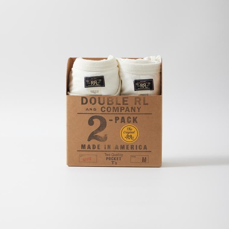 Double RL(ダブルアールエル)の2 PACK TEES SHORT SLEEVE T SHIRT COTTON。同色、同サイズのTシャツ2枚入りのパックT。2022年春夏の「黒」に続き、2023年春夏で待望の「白」が登場!コットンジャージー素材を使用したアメリカ製のクルーネックのポケットTシャツ。左胸にパッチポケットを配置。1枚で着用した時のポイントに。パッケージデザインもDouble RL(ダブルアールエル)の拘りが感じ取れます。真っ白ではなく生成りっぽい色もオールドな雰囲気。製品にしてからの洗い加工による古着のTシャツのような風合いもポイント。