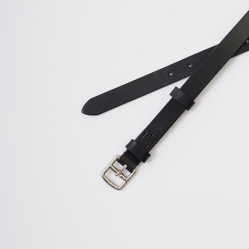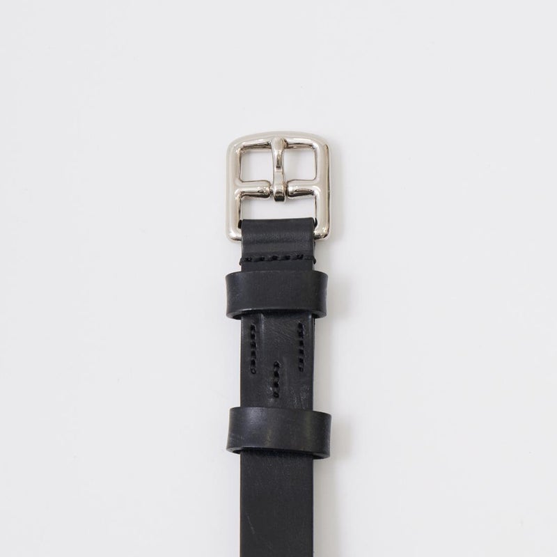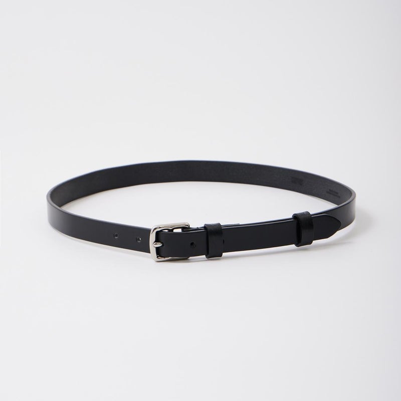 BEORMA LEATHER COMPANY(ベオーマレザーカンパニー)のBRIDLE LEATHER 22mm DOUBLE LOOP BELT。ワンピース(一枚革)仕立てで作られたブライドルレザーベルト。22mm幅のナローベルト。ベルトループは伝統的なダブルループ仕様を継承。馬具の鐙(あぶみ)部分に使われている特徴的なバックルを採用。艶やかな光沢を放つ真鍮ニッケルコーティングのバックル。男性のみならず女性にも使いやすい1本。