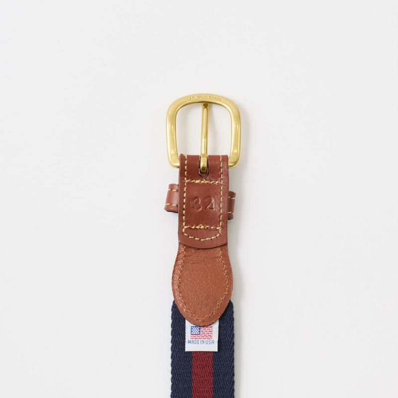 LEATHERMAN BELT (レザーマンベルト) 1.25 STRIPED COTTON SURCINGLE W/YELLOW STITCHED TABS BRASS HARNESS BUCKLE - NAVY_MAROON