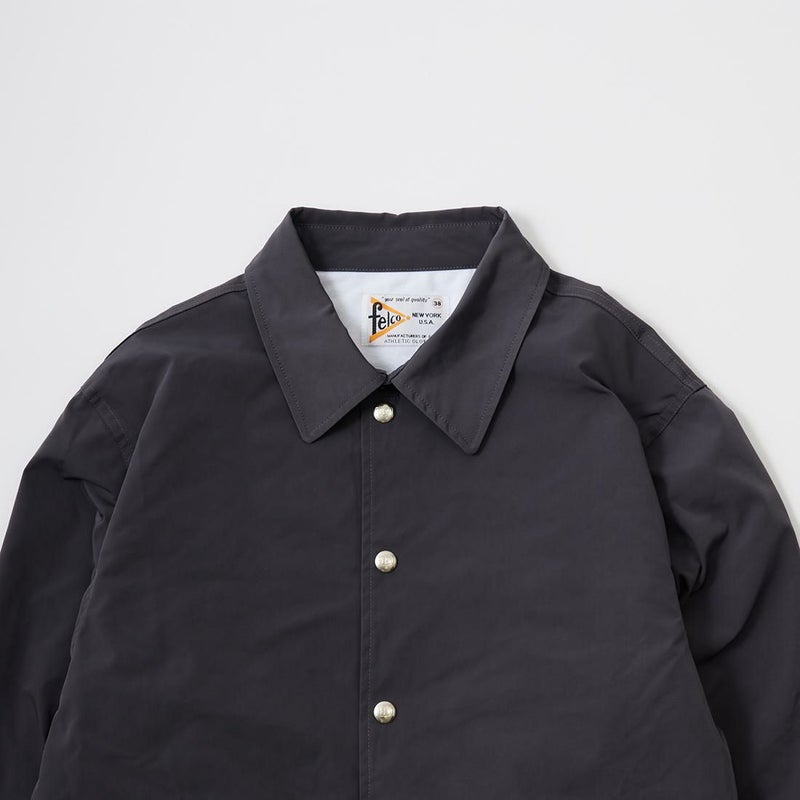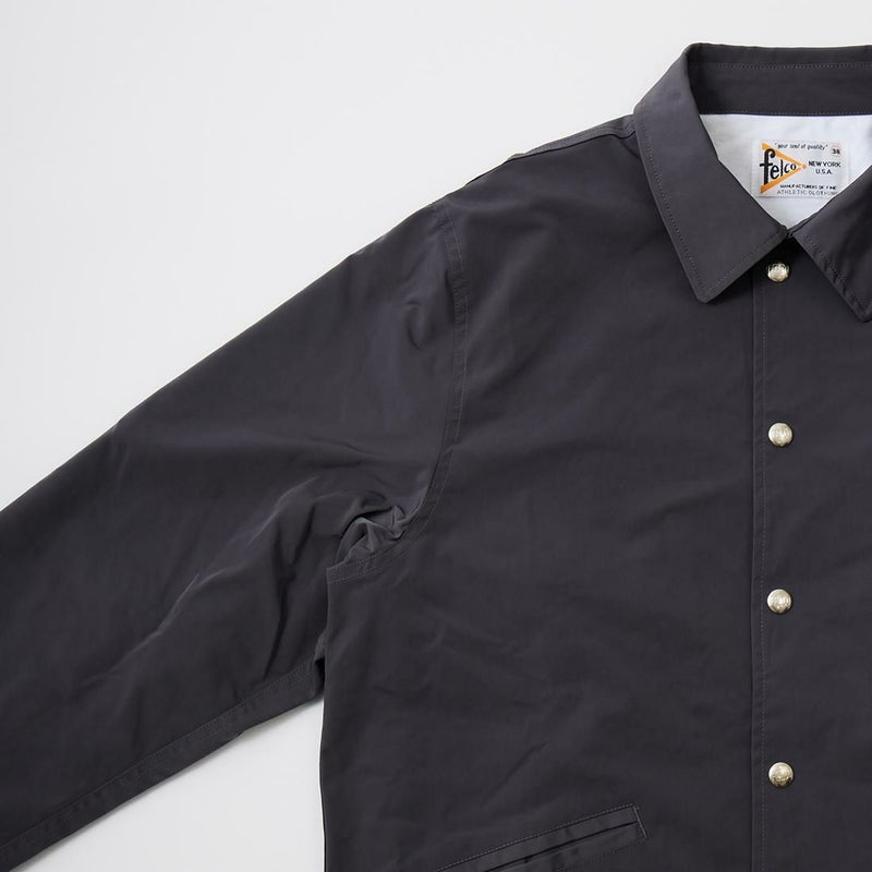 FELCO(フェルコ)のSET IN SLEEVE COACH JACKET SNAP BUTTON FRONT W/FLANNEL LINING CLASSIC FIT。撥水性を持つウォータープルーフナイロンを使用したスナップフロントのコーチジャケット。襟は大きめで風防のチンストラップが付属。ポケットはフロントに2つと、内ポケット2つ、そして背面右側にはデザインとしてもポイントになるポケットを配置。裏地にはコットンフランネルのライニングが付き、袖口はスナップでサイズ調整が可能なゴム仕様。こちらは従来のモデルよりも全体的にゆとりを持たせたクラシックフィット。ストレスのない着用感で重ね着もし易いコーチジャケットに仕上がっています。