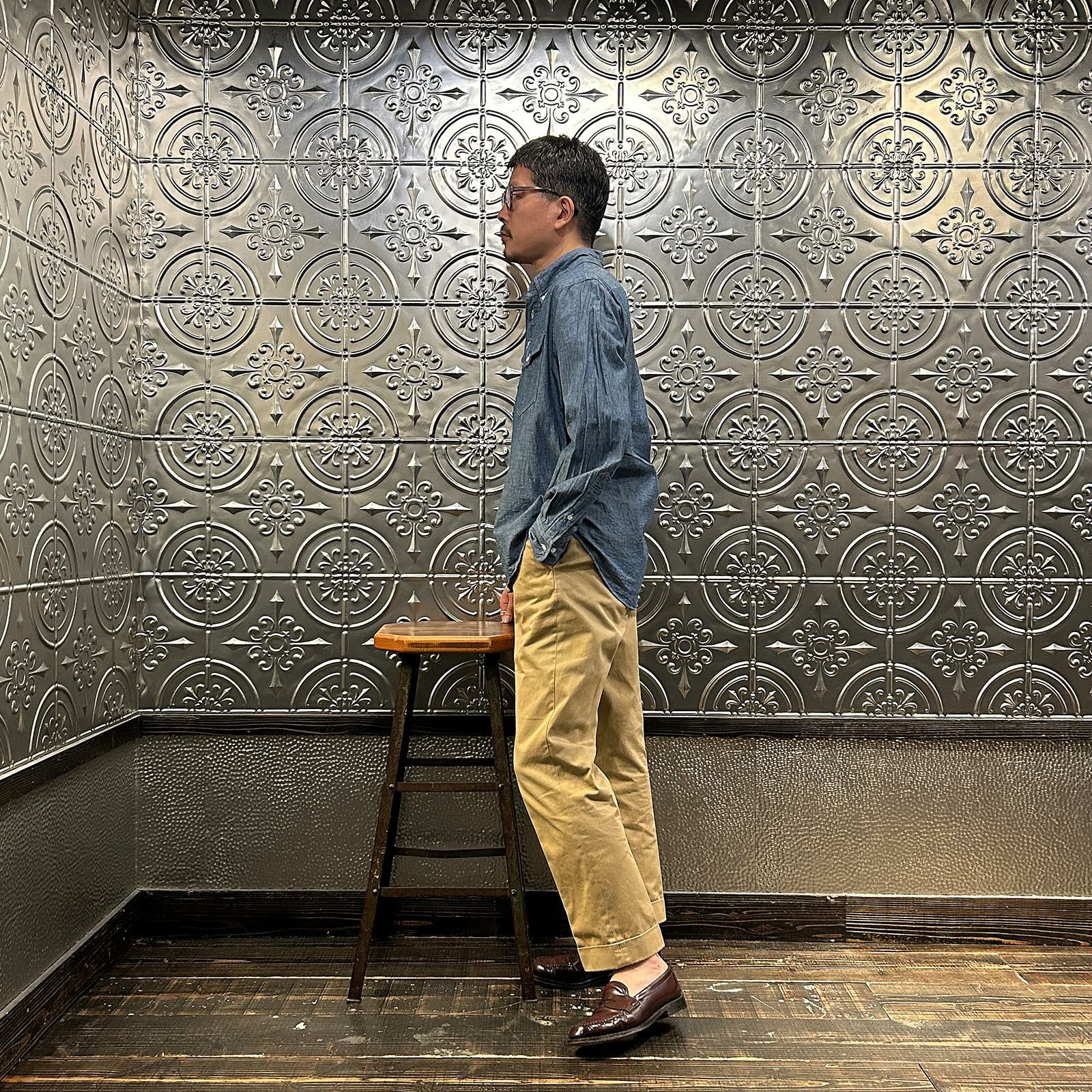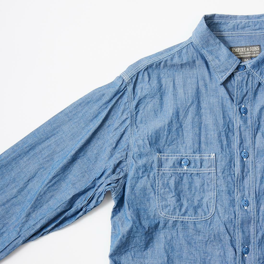 他の画像を見る ワークシャツ 5オンス オーガニックコットン セルビッチシャンブレー 日本製 EMPIRE & SONS (エンパイア アンド サンズ) L/S USN STYLE WORK SHIRT 5oz ORGANIC COTTON SELVEGE CHAMBRAY - BLUE 販売価格 ¥ 18,480 税込 お気に入りに登録する