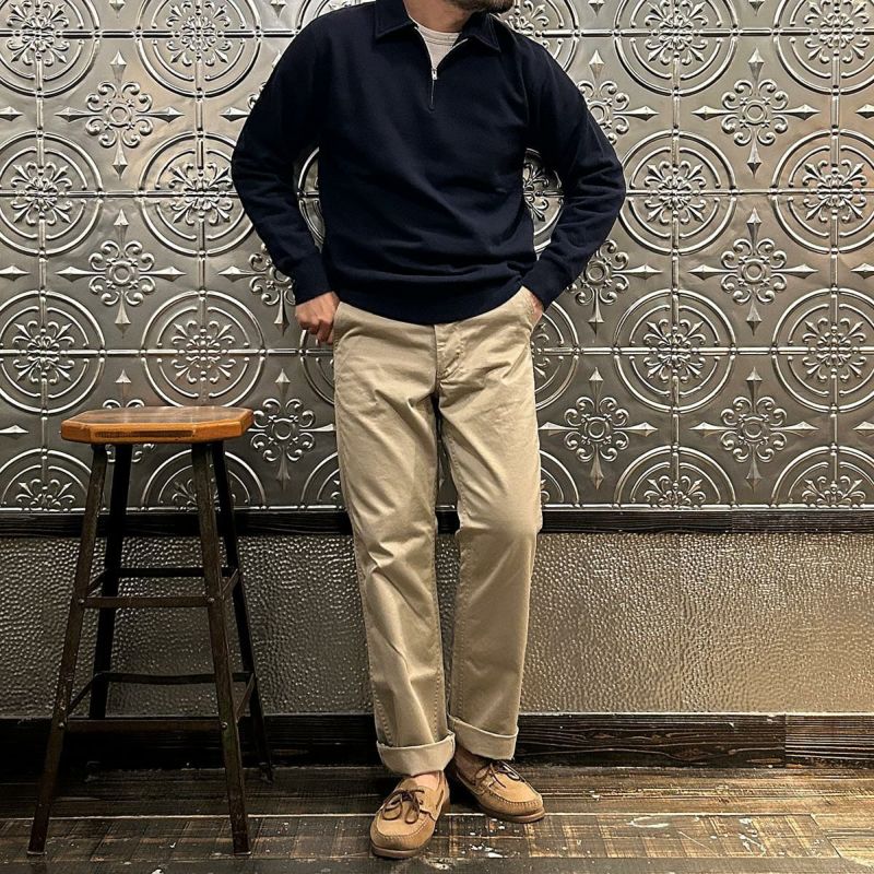 FELCO(フェルコ)の10oz LT WEIGHT FRENCH TERRY L/S HALF ZIP COLLARED SWEAT。10オンスのフレンチテリー(裏起毛していないスウェット生地)素材を使用したセットインスリーブのハーフジップのスウェットシャツ。40-50年代に多く見られるハーフジップの襟付きタイプのスウェットを現代風にモディファイ。袖口、裾はヴィンテージライクな長めのリブ仕様。肩や脇部分はフラットシーム仕上げ。特に襟周りのフィッティング、襟の立ち上がりや上着を着た時の襟の収まりに拘った一枚