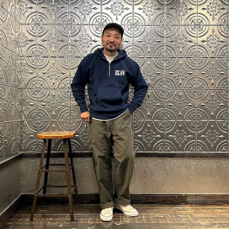 アメリカを代表するアスレティックウェアブランド「CHAMPION チャンピオン」の TRUE TO ARCHIVES REVERSE WEAVE HALF ZIP HOODED SWEAT SHIRT - NAVY PLASTISOL PRINT 。リバースウィーブ仕様のハーフジップのスウェットパーカー。1960年代後期のポリエステル混紡の生地で復刻。旧式のシンカー編み機で編みたてた独特のフワッとしたボリュームのある生地感が特徴。アメリカの空軍士官学校「USAFA」モチーフのプリント。70年代にチャンピオンが実際に同校に納入していたモデルの復刻。ジップはアメリカのタロン社の60年代以降の貴重なデッドストックを使用。手で押さえて止める「カムロックタイプ」のジップ。ネームタグは青単タグ。袖口の「C」ロゴなし仕様も当時の仕様のまま。生地や仕様に拘って生産されるトゥルートゥーアーカイブのシリーズとはいえ、かなりの熱量で復刻されたスウェットシャツ。