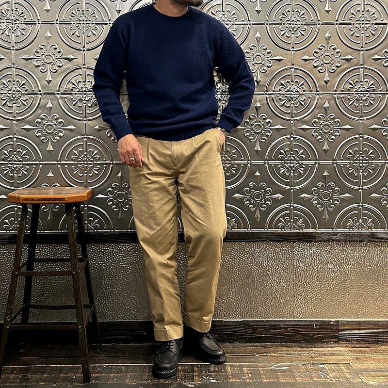 確かなクオリティとインポートブランドながらもコストパフォーマンスに優れたアイテムを数多くリリースするHARLEY OF SCOTLAND(ハーレーオブスコットランド)。縫い目のない一つ凪で作られるシームレス製法が特徴。ウールの温かみが感じられるミドルゲージの編地。こちらは着丈、袖丈を2.5センチ程度長く変更してもらった別注モデルになります。
