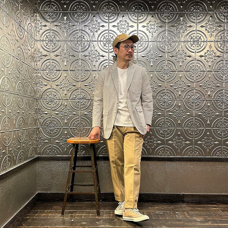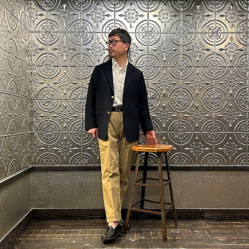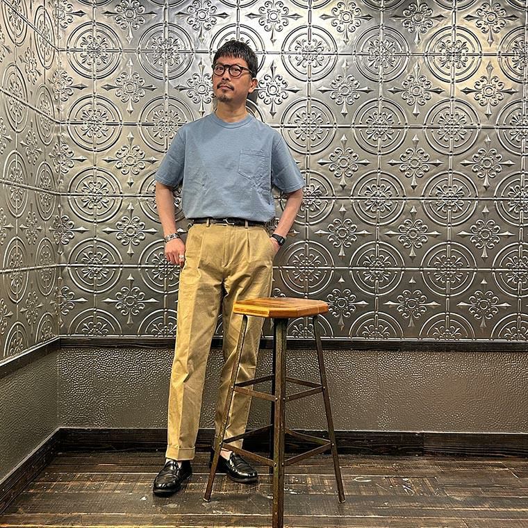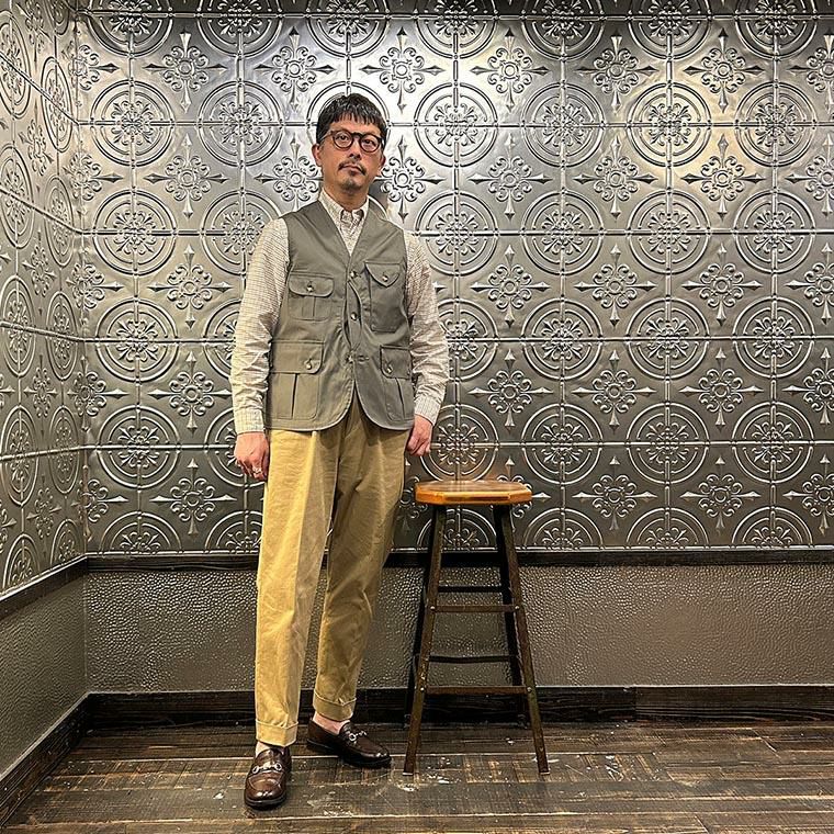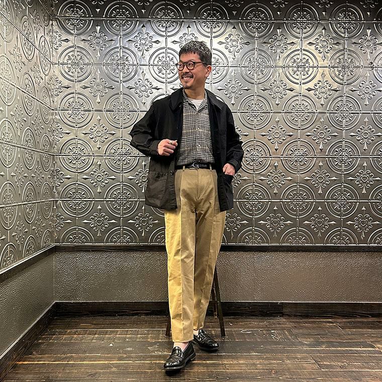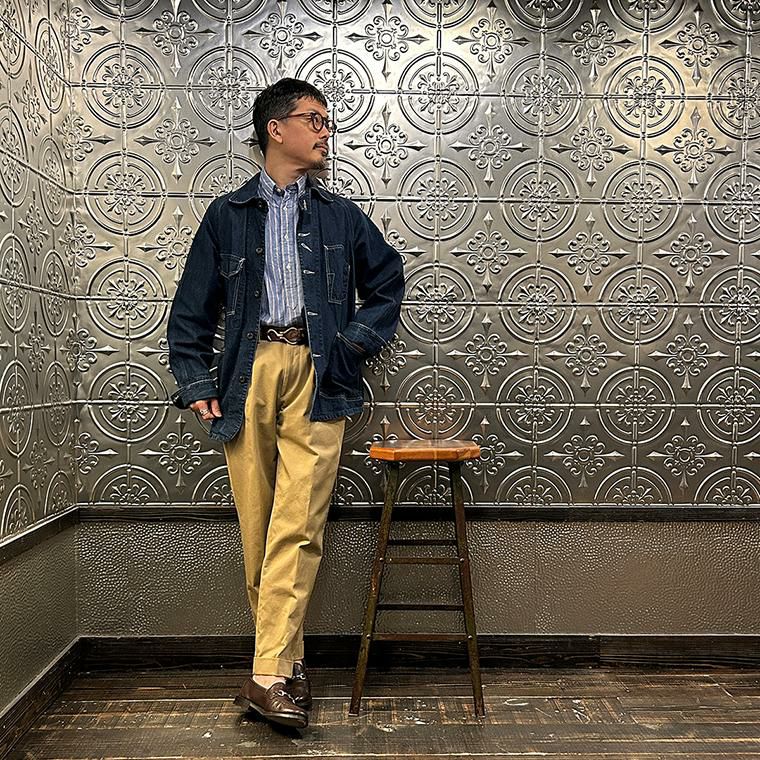 172センチ60キロでサイズは「M」を着用しています。少しウェストにゆとりはあります。「S」でも穿けない事はないのですがウェストがかなりギリギリなので「M」サイズが適正サイズだと思っています。自身の所有しているチノをベースに作ってもらった別注。申し訳ない位サンプルの修正を何度もして頂きようやく完成した一本。往年のアメリカンチノの雰囲気(いい意味で「いなたい」)を残しつつ、今の気分で穿けるモノが欲しかった。