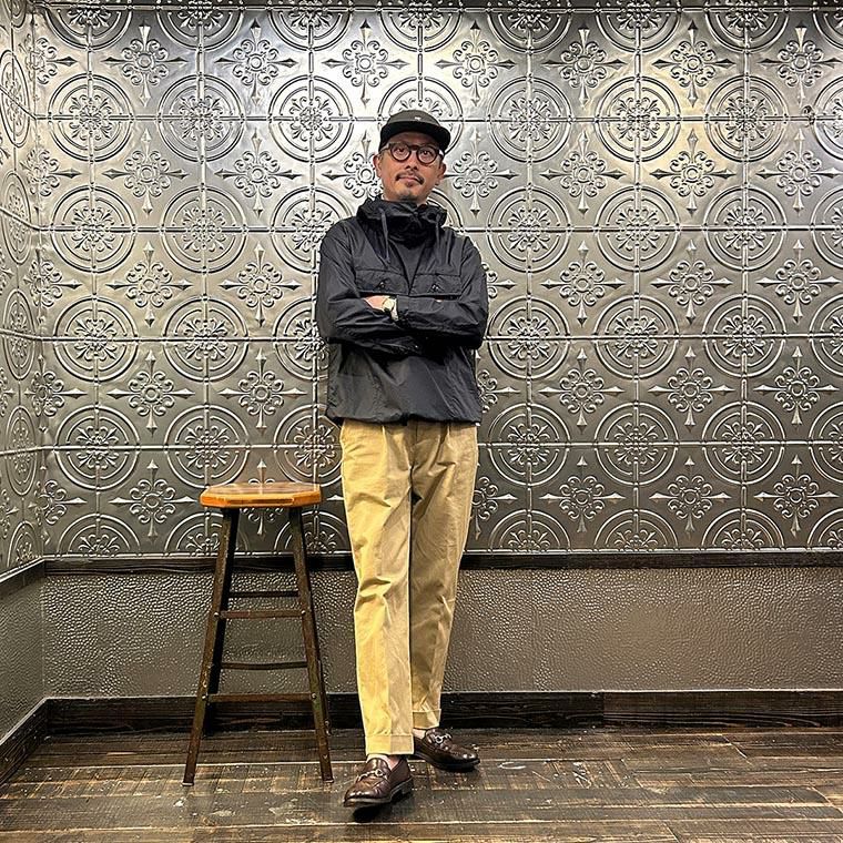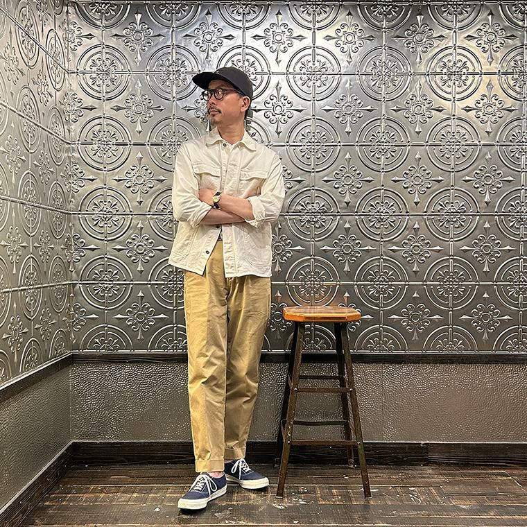 170センチ68キロの私の体型で通常31~32インチをベースにパンツを選びますが、こちらのサイズ選びはLで丁度良いです。このサイズであればシャツをインしてもストレスなく穿けます。股上は深め。ワタリは程よくゆとりがあり、膝から裾に向かって緩やかにテーパードが効いたシルエット。何度も何度も納得いくまで修正を繰り返し完成したスペシャルなパンツ。生地は通年(真夏以外)穿けて、ガシガシ洗って楽しむコットンチノクロス。経年変化好きな方には堪らない素材。王道でいくならカーキ。ですが爽やかに合わせたいならストーンも素敵ですよ。様々シーン、幅広いスタイリングにも対応できるとにかく汎用性に優れた1本に仕上げました。