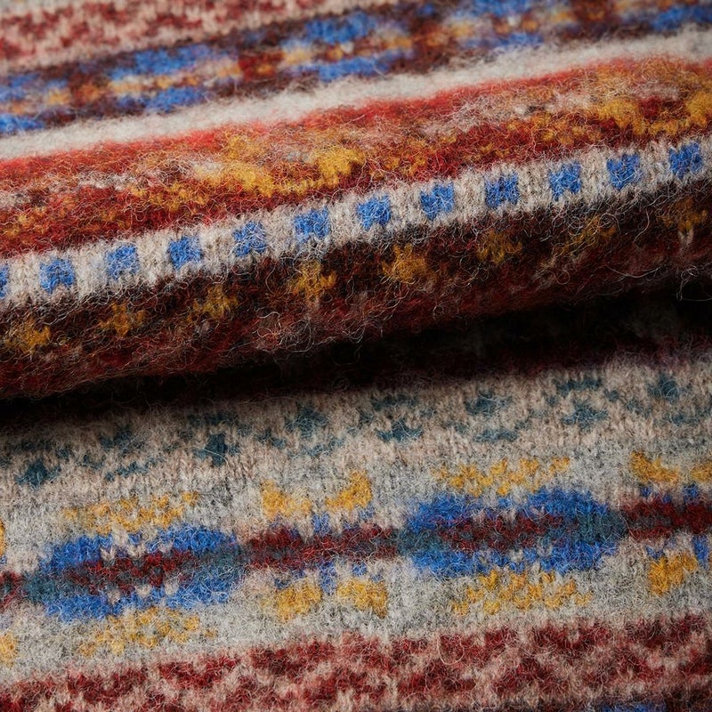 JAMIESON'S(ジャミーソンズ)のAOFI CREW NECK PULLOVER BRUSHED。クルーネックのフェアアイル柄のニット。スコットランド・シェットランド諸島産の上質な羊毛を植物染色し、色鮮やかな幾何学模様に編み立てたフェアアイルニット。 美しい発色とナチュラルな柔らかい風合い、軽くて暖かい着心地が特徴的なセーター。未だにアザミの棘で生地の表面を起毛する伝統的な手法を踏襲。通称シャギードッグセーター。フェアアイル柄のカラフルでパキッとした表情が起毛によって柔らかいボケた雰囲気に変化。柄物に苦手意識がる方でも取り入れやすいように別注しました。