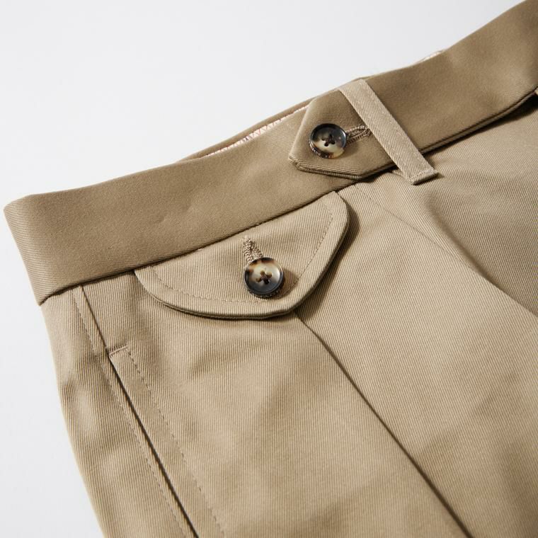 BARNSTORMER(バーンストーマー)のMACARTHUR 2 DRESS CHINO PANT。アメリカの陸軍士官学校の制服に由来するウェストポイント(通称ウェポン)生地を使用。更にその生地に「コールドマーセ」という今では幻の技術と言われる加工が施されています。コールドマーセは樹脂を-16度で凍らせながら浸透させる技術。フラットで美しい表面ができパリッとした質感になります。股上や、腰裏のガゼット、脇の縫い代を前後差を付けたBARNSTOMER(バーンストーマー)の定番ディティールに加え、ピンループや天狗、ウォッチポケットのフラップなどが特徴的なディテール。こちらはノンウォッシュで裾上げされていない状態での納品。着用時には裾上げが必要になります。