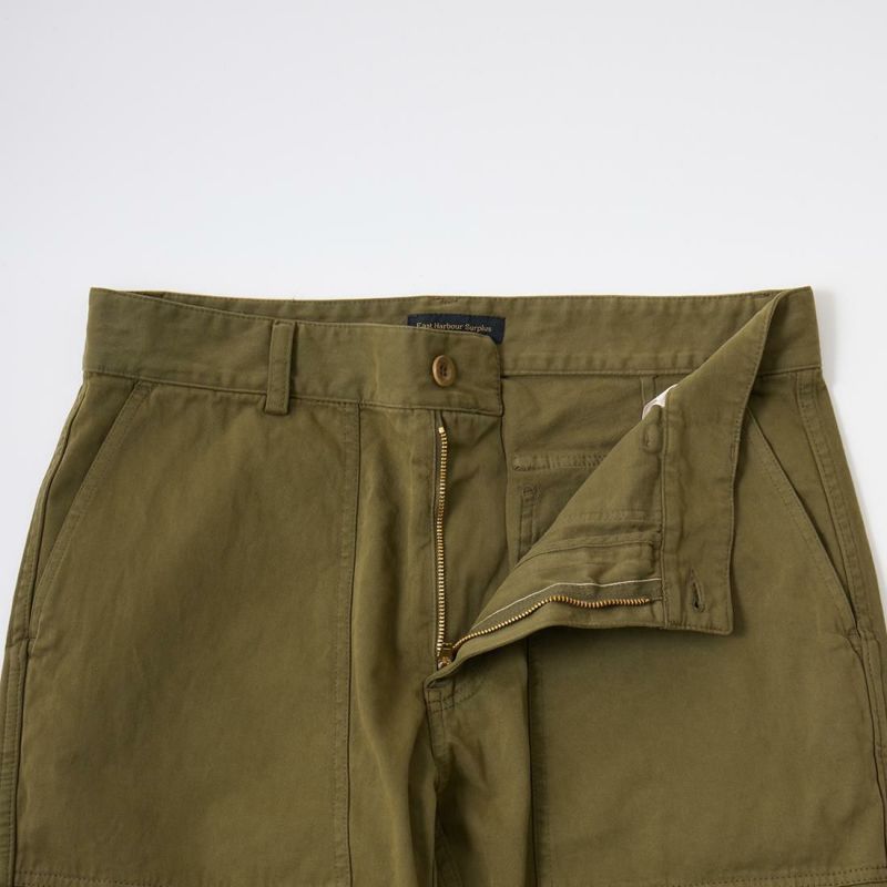 EAST HARBOUR SURPLUS(イーストハーバーサープラス)のTRUNK WASHED FATIGUE PANT。日本代理店の別注モデルのファティーグパンツ。フロントのパッチポケット、バックのフラップポケットが特徴的なディテール。フロントはジップフロント。大き目のサイズのパッチポケットがミリタリーパンツらしい部分。腿回りには適度なゆとりがあり膝下からテーパードの効いた綺麗なシルエット。ウォッシュ加工されたコットンツイル素材も良い雰囲気の1本です。