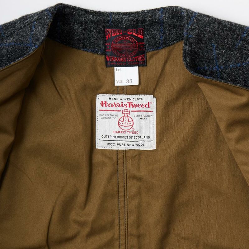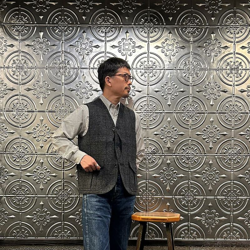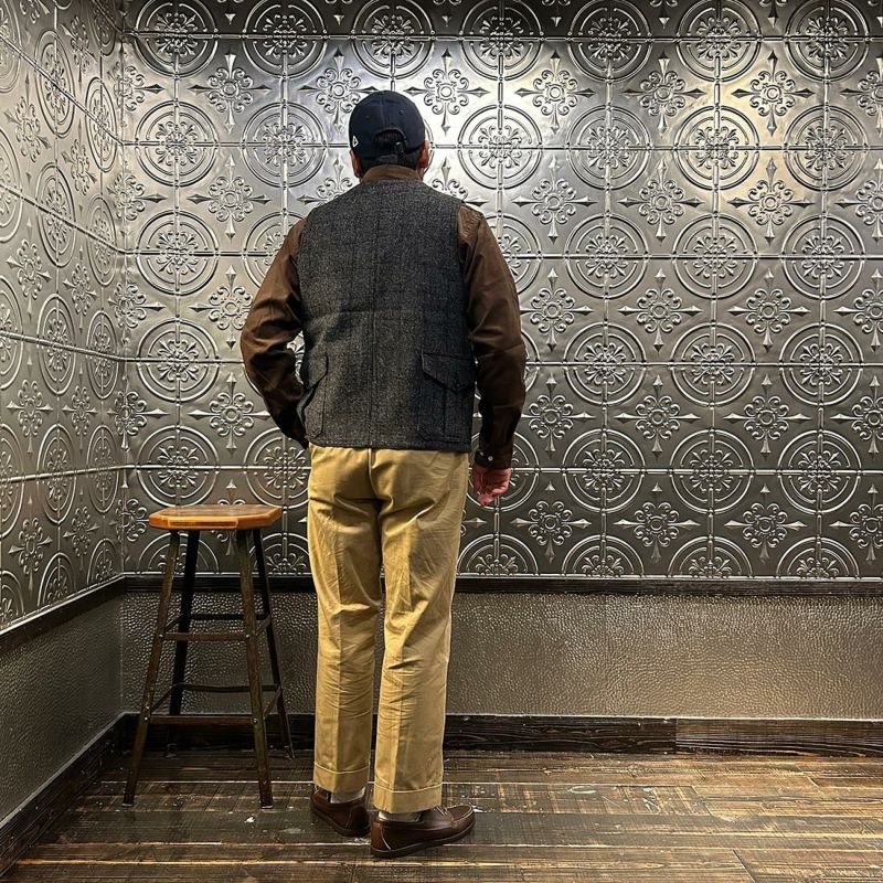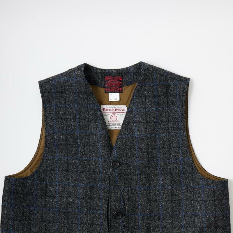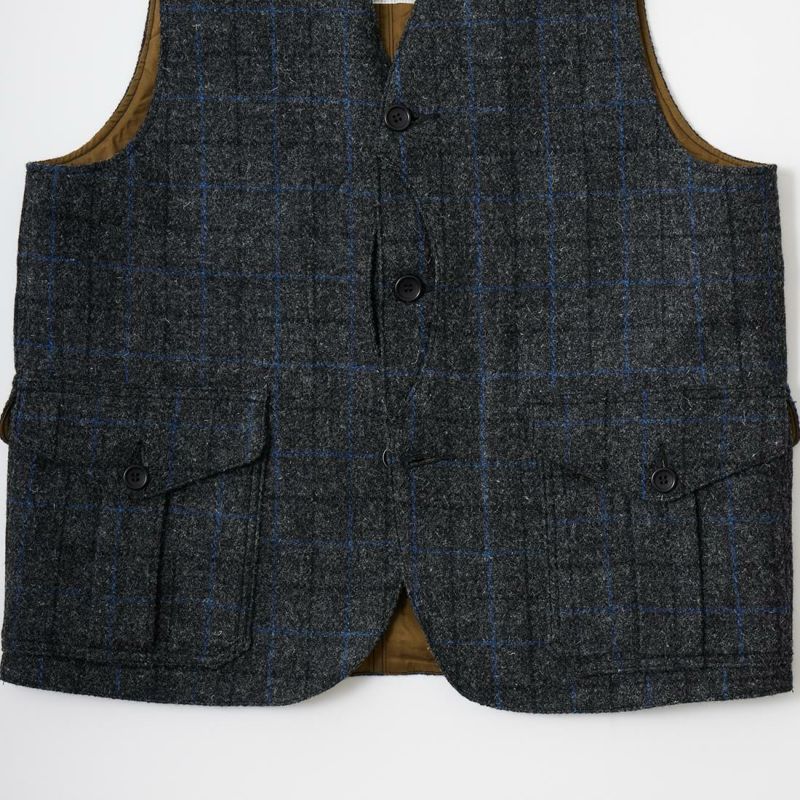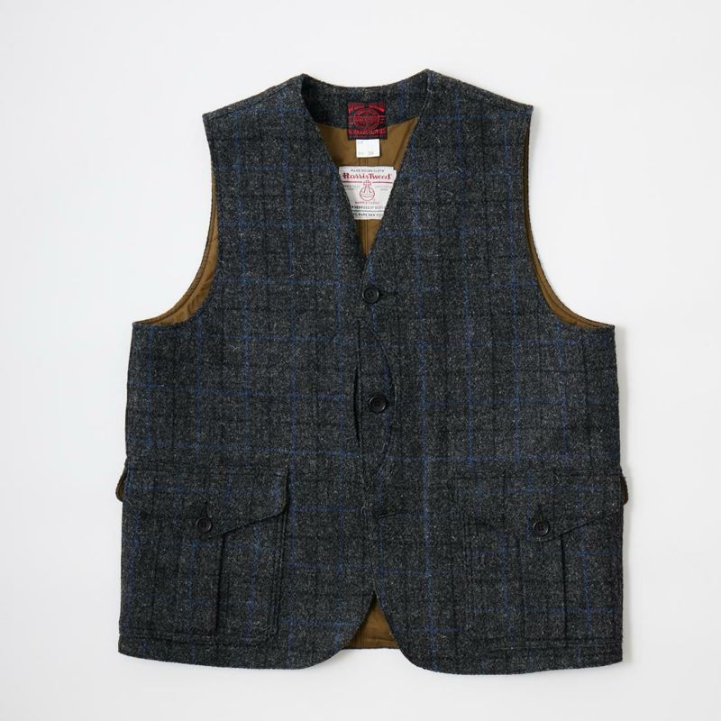 WORKERS(ワーカーズ)のCRUISER VEST HARRIS TWEED。ヴィンテージのハンティングベストをベースに街着として使いやすい素材・サイズ感にアレンジ。腰の二室ポケット、フロントの三日月型ポケット、内ポケットも左右に二つ。フロント、バック共に裏地付き。本来、ハンティングで獲物を入れたり、道具を入れて両手をあけるための「道具服」。腰ポケットは大型ポケットを真ん中で二つに分けたもの。フロントの三日月も左右対称でつけられています。素材はハリスツイード。グレーベースのチェック柄。控えめのチェック柄がスタイリングに馴染みやすくちょっとしたポイントになってくれる1着。