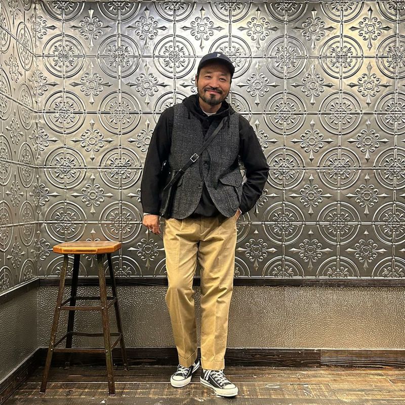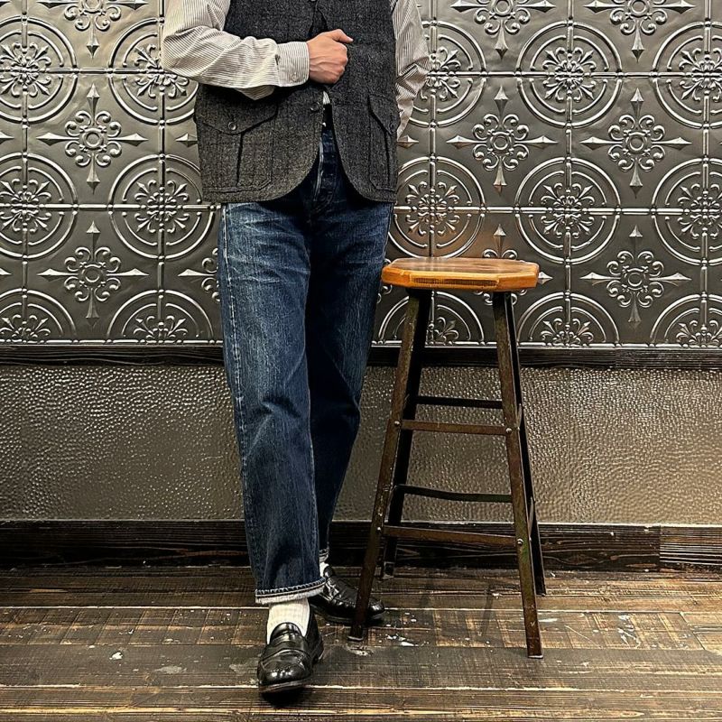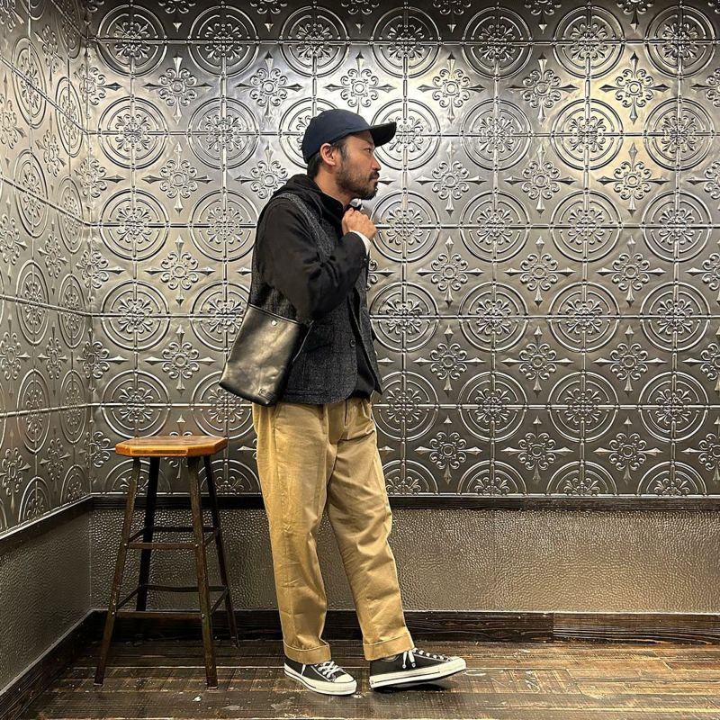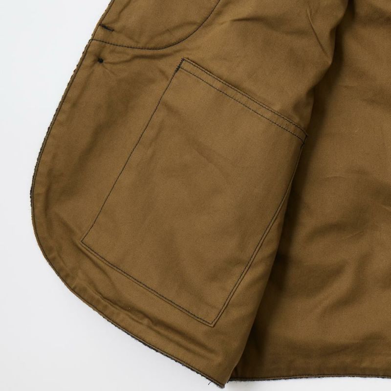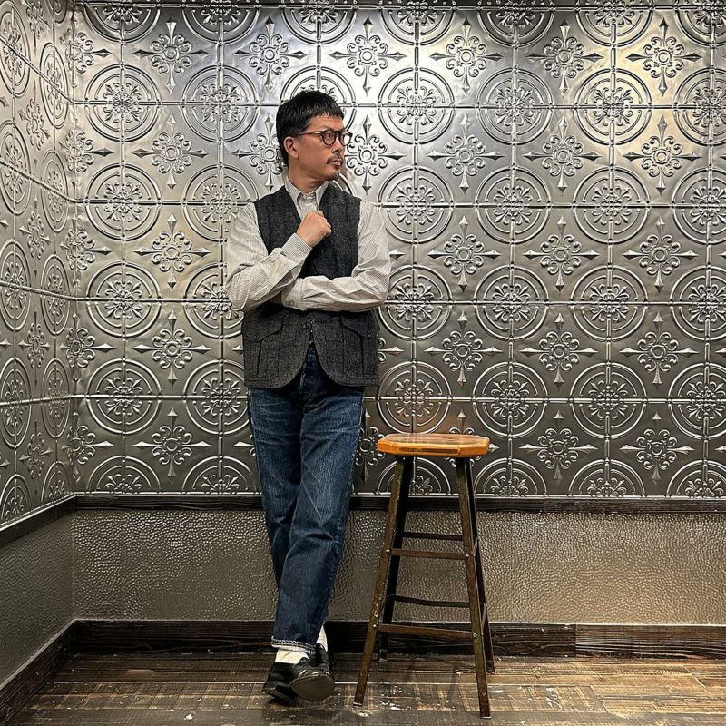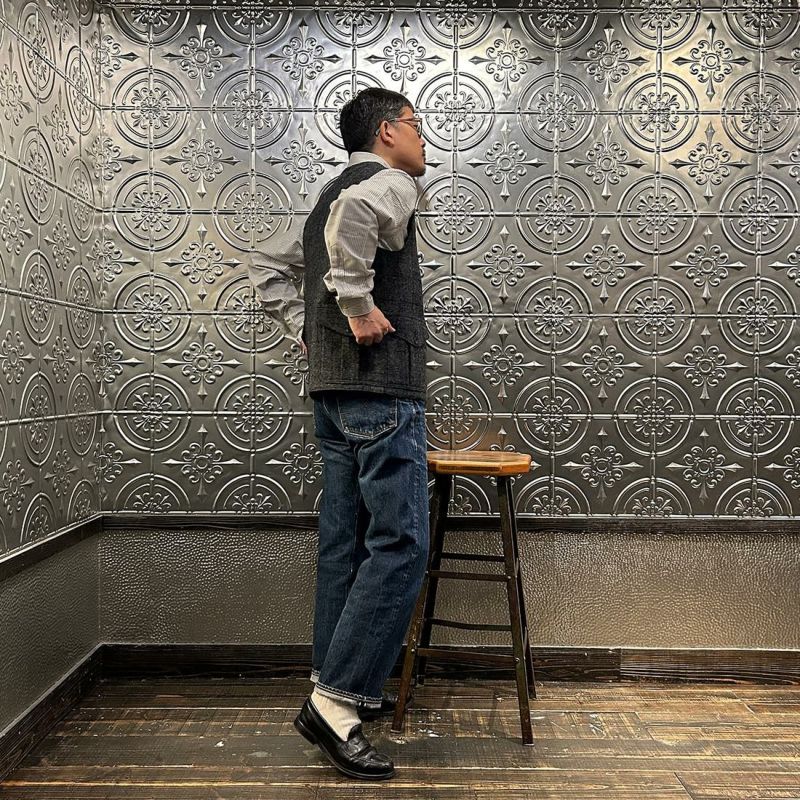 WORKERS(ワーカーズ)のCRUISER VEST HARRIS TWEED。ヴィンテージのハンティングベストをベースに街着として使いやすい素材・サイズ感にアレンジ。腰の二室ポケット、フロントの三日月型ポケット、内ポケットも左右に二つ。フロント、バック共に裏地付き。本来、ハンティングで獲物を入れたり、道具を入れて両手をあけるための「道具服」。腰ポケットは大型ポケットを真ん中で二つに分けたもの。フロントの三日月も左右対称でつけられています。素材はハリスツイード。グレーベースのチェック柄。控えめのチェック柄がスタイリングに馴染みやすくちょっとしたポイントになってくれる1着。