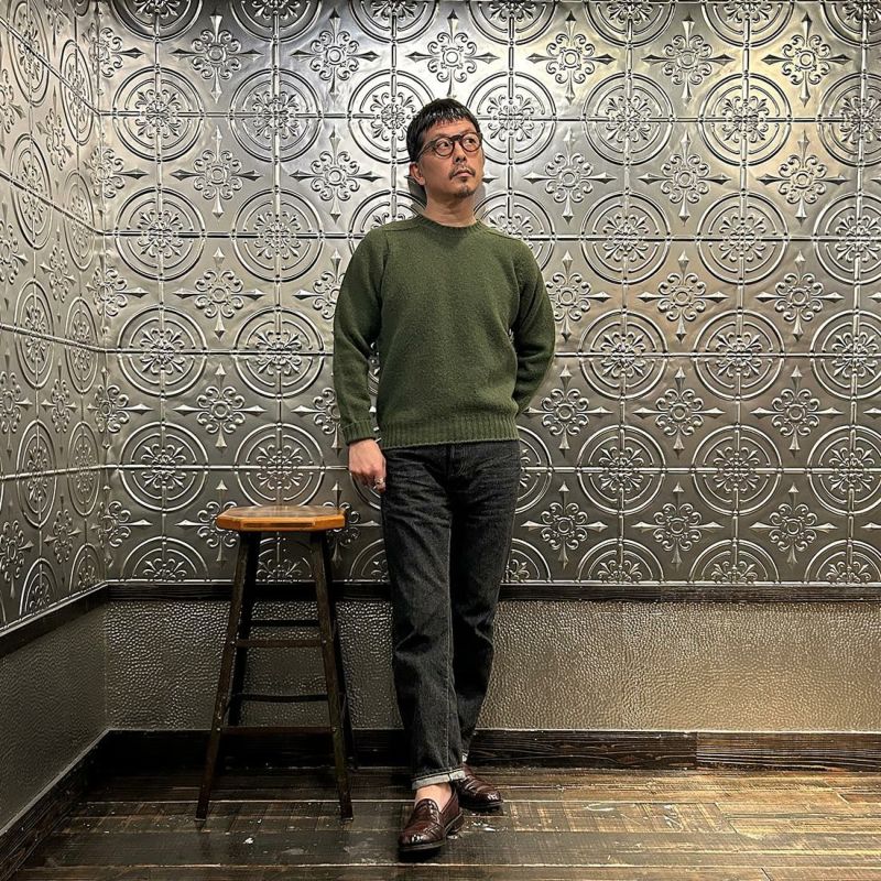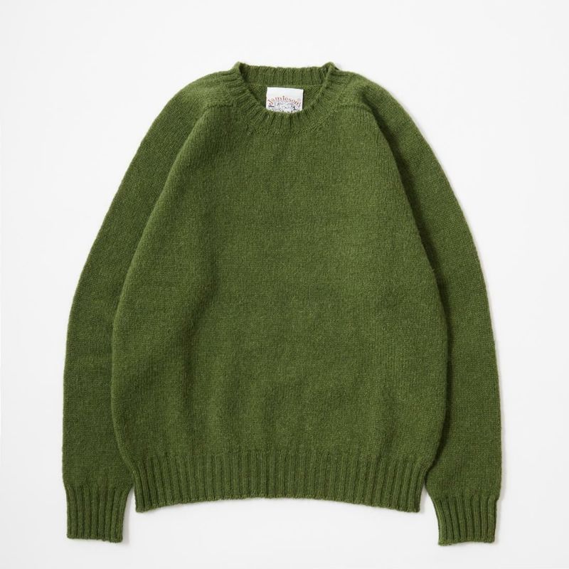JAMIESON'S(ジャミーソンズ)のPLAIN SADDLE SHOULDER CREW NECK。シンプルな無地のシェットランドセーター。肩はラグランスリーブの一種のサドルショルダー。肩部分が並行でラグランスリーブより切り替えの形が角張った形。鞍(サドル)をかけたような見た目が由来。袖と脇のサイドシームが無いホールガーメントで編み上げたシームレス仕様。スタンダードなデザインでスタイルを選ばない使い勝手の良い1着です。