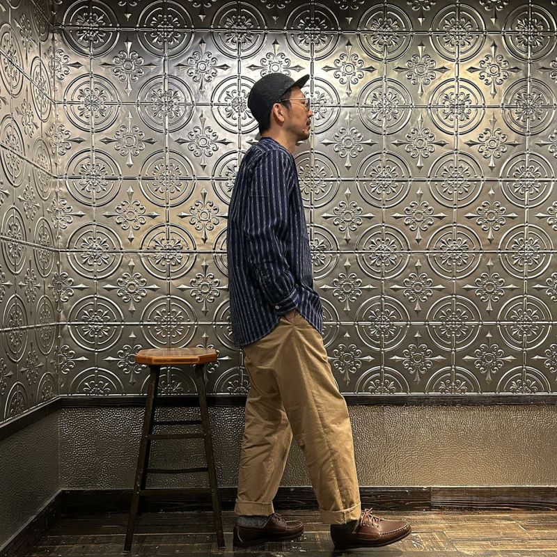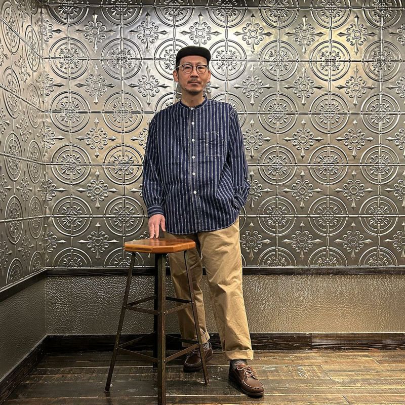 【SALE】POST OVERALLS (ポストオーバーオールズ) BAND COLLAR SHIRT MV STRIPE SHIRTING - NATURAL
