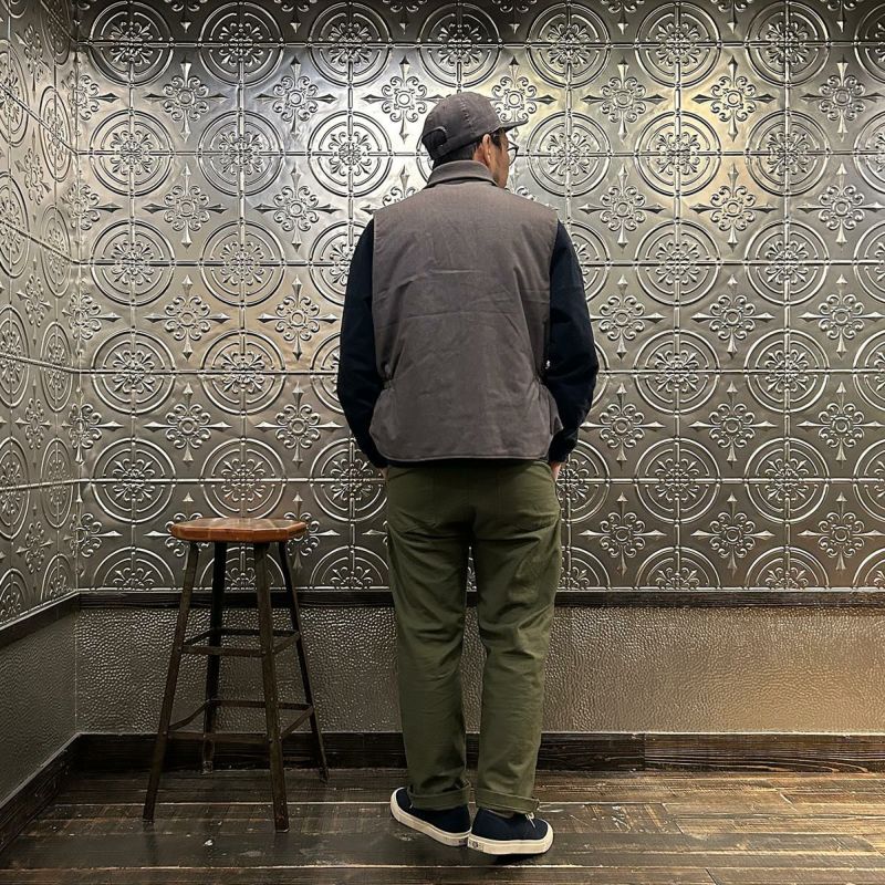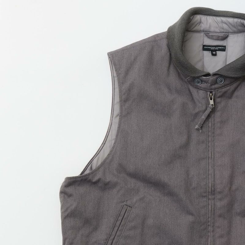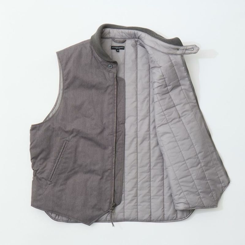 ENGINEERED GARMENTS(エンジニアドガーメンツ)のLL VEST PC TANKER TWILL。コットンポリエステルのツイル素材を使用したエルエルベスト。首元はリブのショールカラーでチンストラップも装備。中綿入りのパデッド仕様でボリュームは感じさせないものの保温性も高いベスト。アウター、インナーと使い勝手の良い1着。