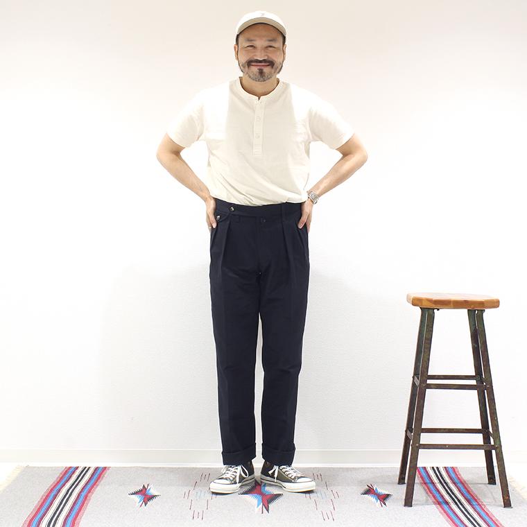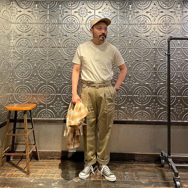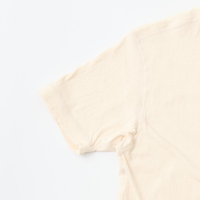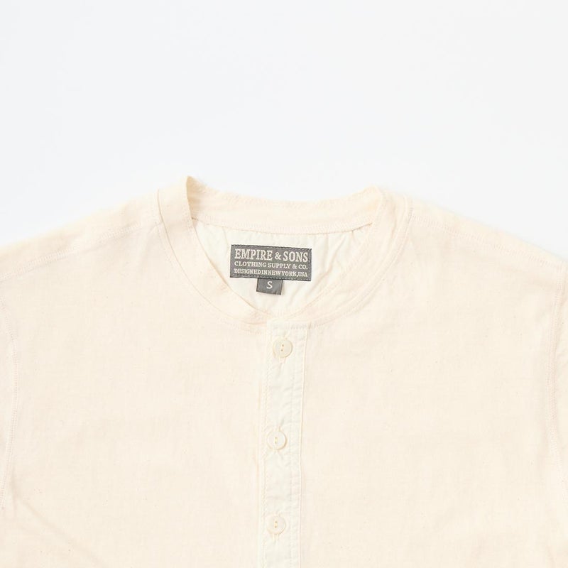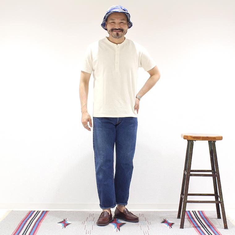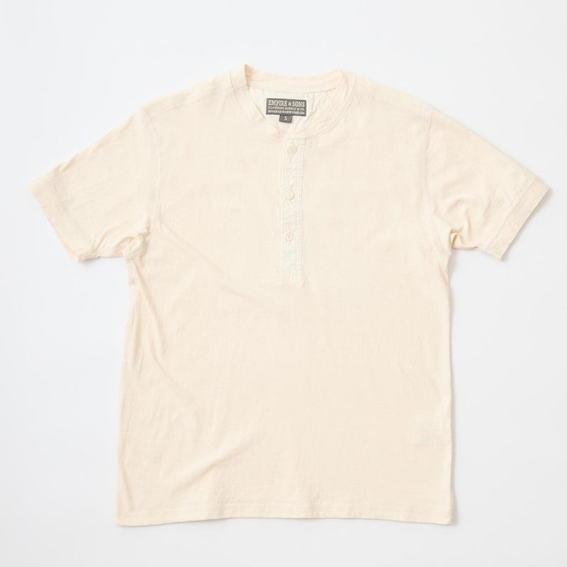 EMPIRE&SONS(エンパイアアンドサンズ)のS/S COALMINER HENLEY 19 SINGLE RUFFY JERSEY。旧きよき時代のアメリカを彷彿とさせるヘンリーネックTシャツ。ボタンは猫目ボタンを使用し、フロントのヘンリー部分はジャージー素材ではなく、伸び縮みしない布帛(ふはく)に切り替えられています。フラットシーマーによる縫製で縫い合わせの部分の凹凸が少なく、着心地も抜群です。首周り、袖部分にもジグザグにステッチングを施すことでヨレを防いでいます。