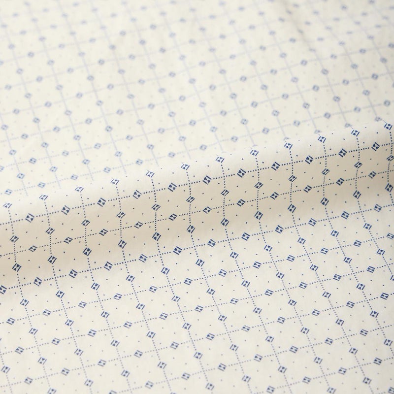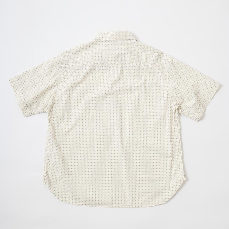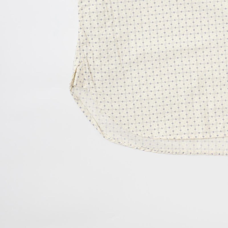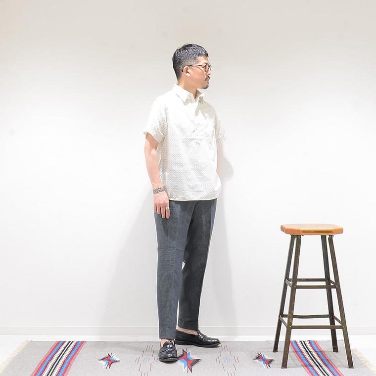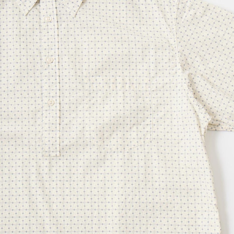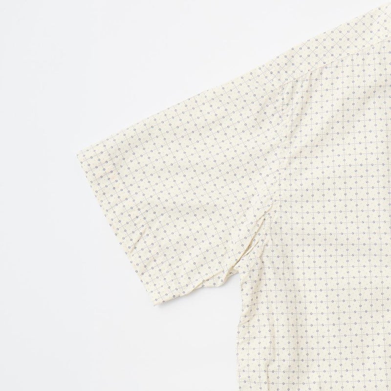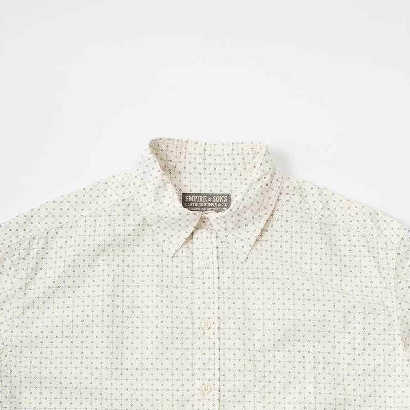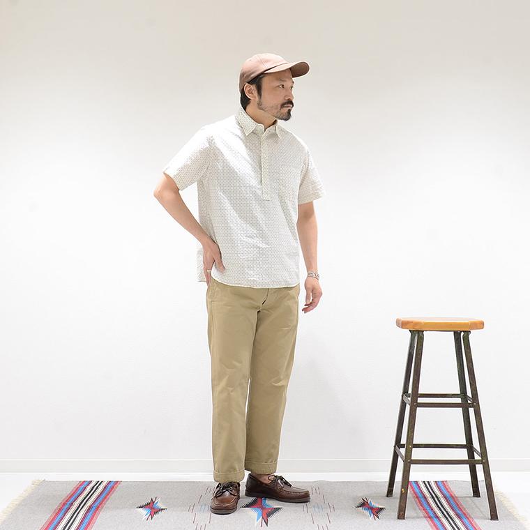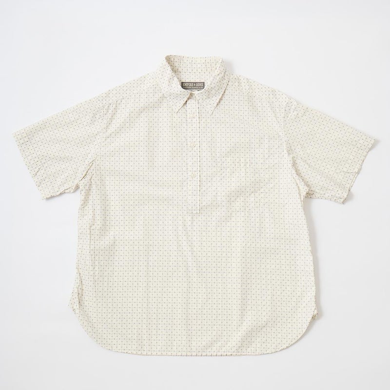 EMPIRE&SONS(エンパイアアンドサンズ)のS/S PULLOVER SHIRT ORGANIC COTTON。生成りベースにネイビーのプリントが全体に施されたコットン素材を使用したプルオーバーの半袖シャツ。左胸のみにパッチポケット付き。ウエストに絞りの無い、リラックス感のあるボックスシルエット。レギュラーカラーに、襟が動かないよう留められるチンストラップを装備しており、ワークシャツのディテールが採用されています。シンプルになりがちな夏のスタイリングでアクセントになってくれ1着です。