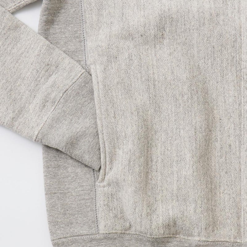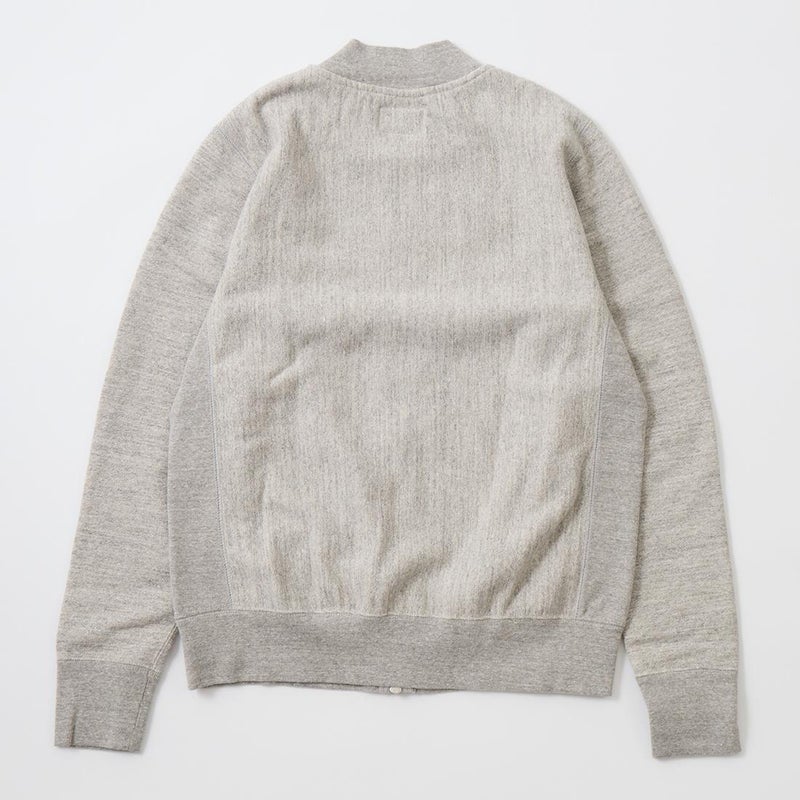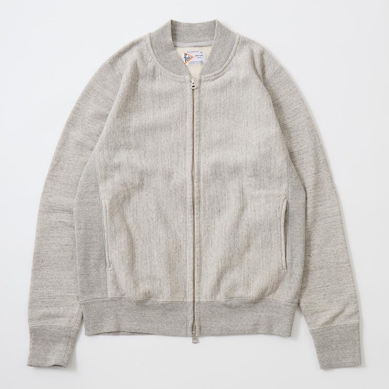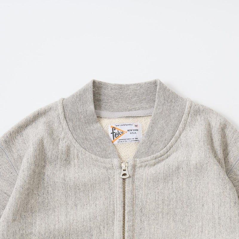 FELCO(フェルコ)の16oz TERRY ZIP BASEBALL NECK W/SLASH POCKET。程よい厚みとコシのある16オンスのヘビーウェイトのフレンチテリー(裏起毛していないスウェット生地)素材を使用したジップフロントのベースボールカラーのジャケット。程良いゆとりのあるシルエットがアメリカらしく良い雰囲気。生地を横向きに使用することで縦縮みを軽減し、サイドリブが横縮み防止と動きやすさを実現したインバースウィーブ仕様。ガシガシ着倒してもへこたれないタフな1枚。袖と裾のリブはやや長めに設定されたヴィンテージを彷彿させる完成度の高いスウェット。腰部分の左右にスラッシュポケットが装備されており機能性も高い1着。アウターとしての使用は勿論ですが、ダウンベストなどのインナーアイテムとしても使って頂ける汎用性も高い1着です。