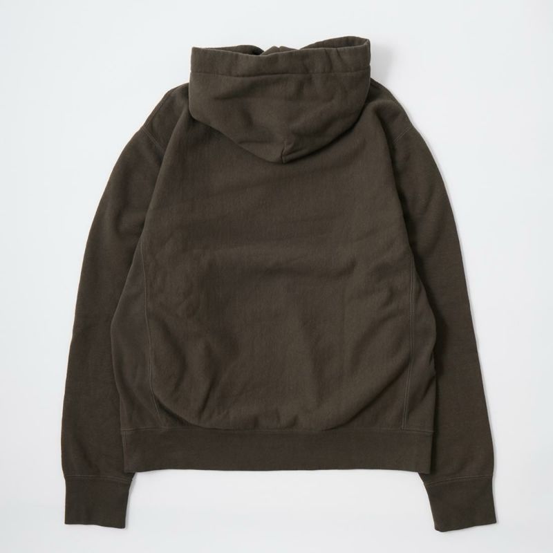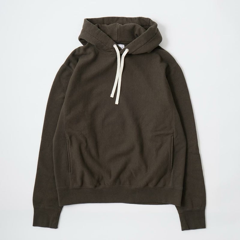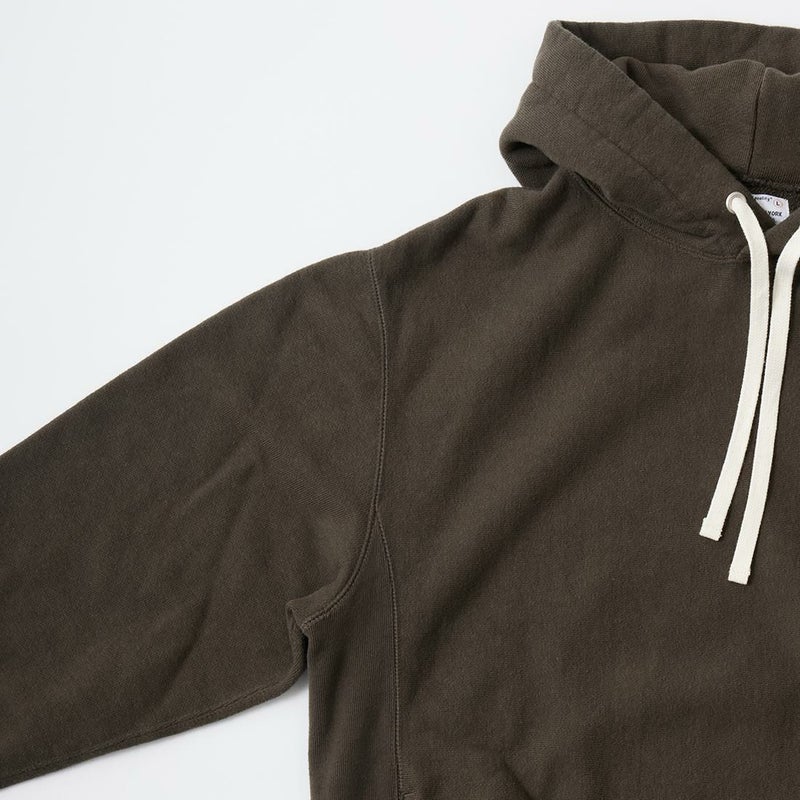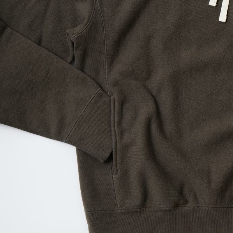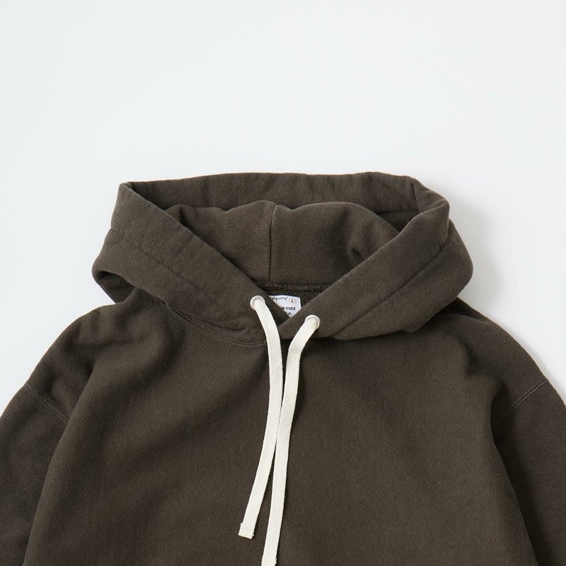 FELCO(フェルコ)の16oz TERRY CLASSIC FIT INVERSE WEAVE SWEAT HOODED PULLOVER。しっかりとした生地感の16オンスのフレンチテリー(裏起毛していないスウェット生地)を使用したプルオーバーパーカー。生地を横向きに使用することで縦縮みを軽減し、サイドリブが横縮み防止と動きやすさを実現したインバースウィーブを仕様。ガシガシ着倒してもへこたれないタフな1枚。袖と裾のリブはやや長めに設定されたヴィンテージを彷彿させるディテール。腰部分に装備された手の入れやすいハンドウォーマーポケットもポイント。従来のモデルよりも全体的にゆとりを持たせたクラシックフィット。ストレスのない着用感のスウェット。