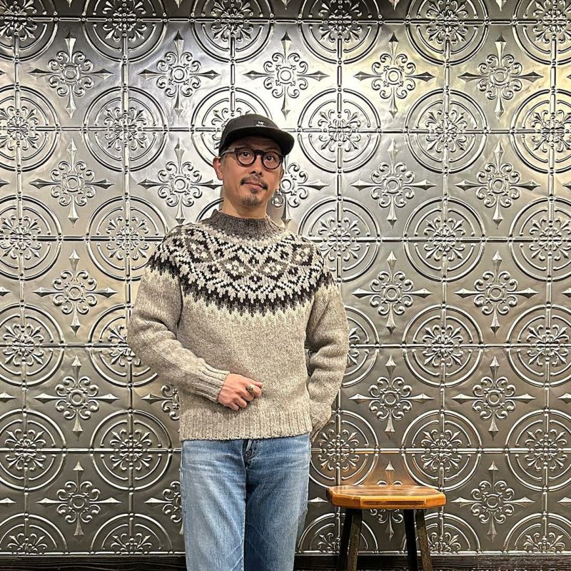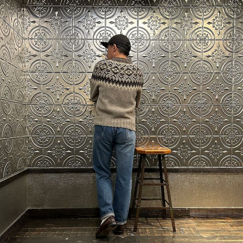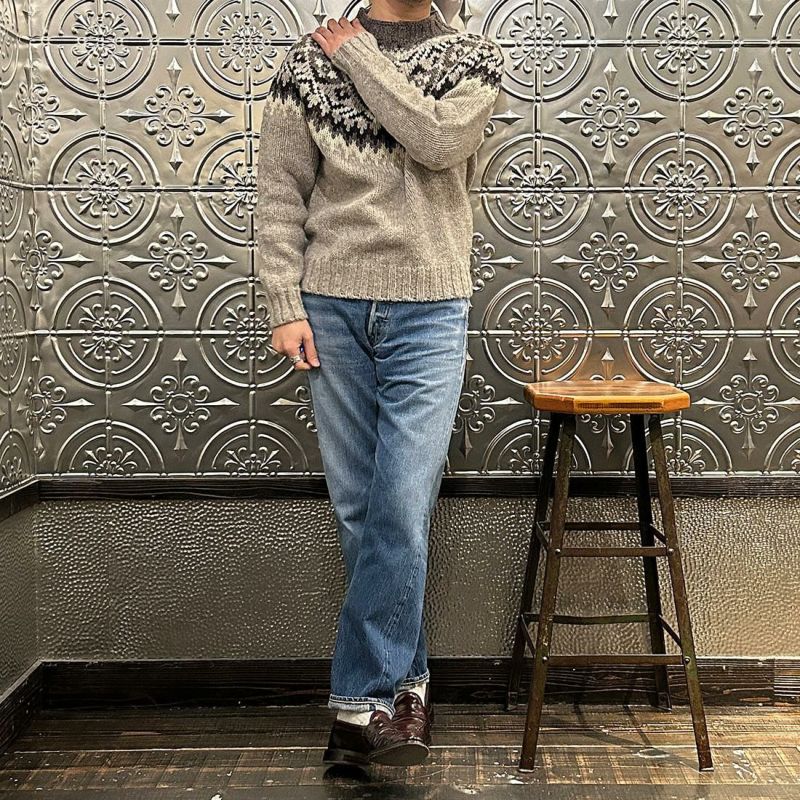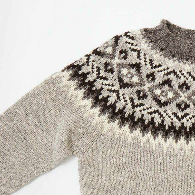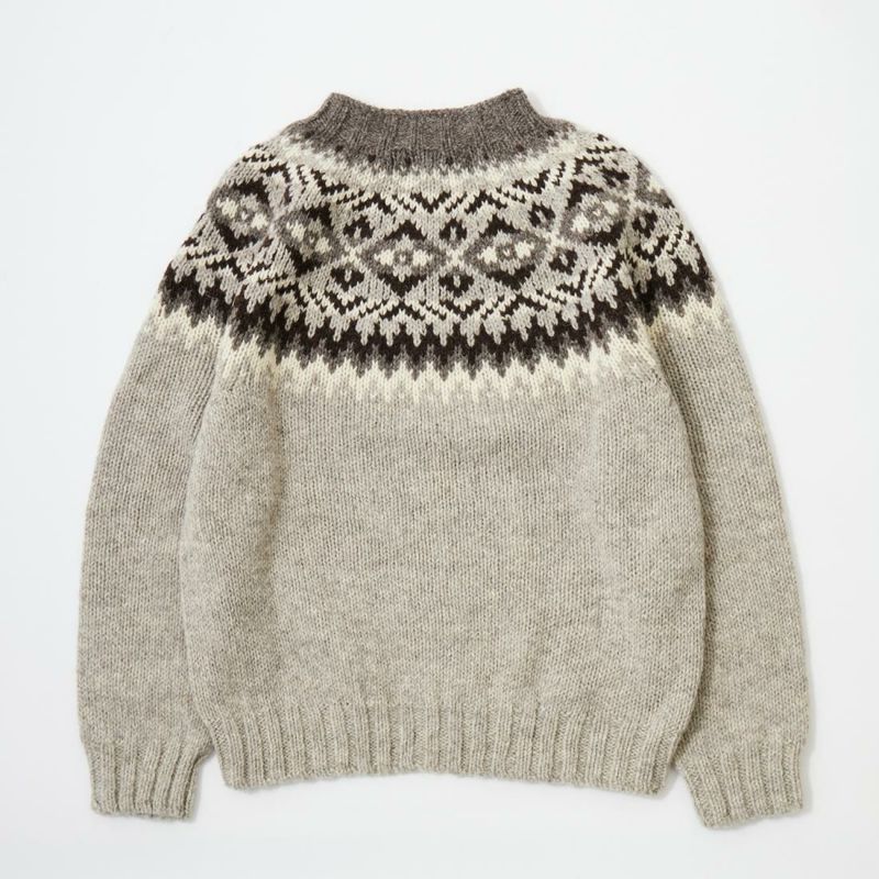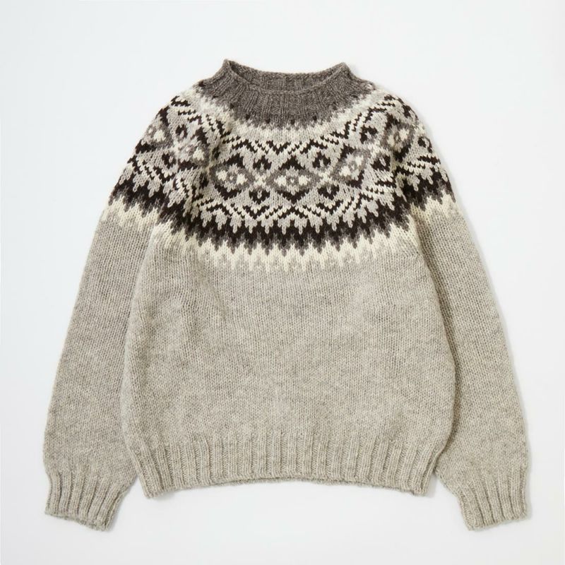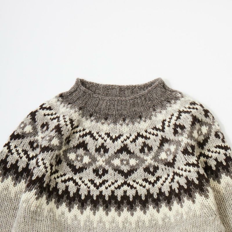 HARLEY OF SCOTLAND(ハーレーオブスコットランド)のFAIRISLE YOKE CREW SWEATER 100%WOOL。肩部分にフェアアイル柄が入ったハイネック(モックネック風)セーター。多色糸で柄を表現。シンプルになりがちな冬のコーディネートのアクセントに最適。縫い目の無い(シームレス)製法で仕上げられているので着心地も抜群。ミドルゲージで保温力と着易さ、着まわしの良さが備わったニット。