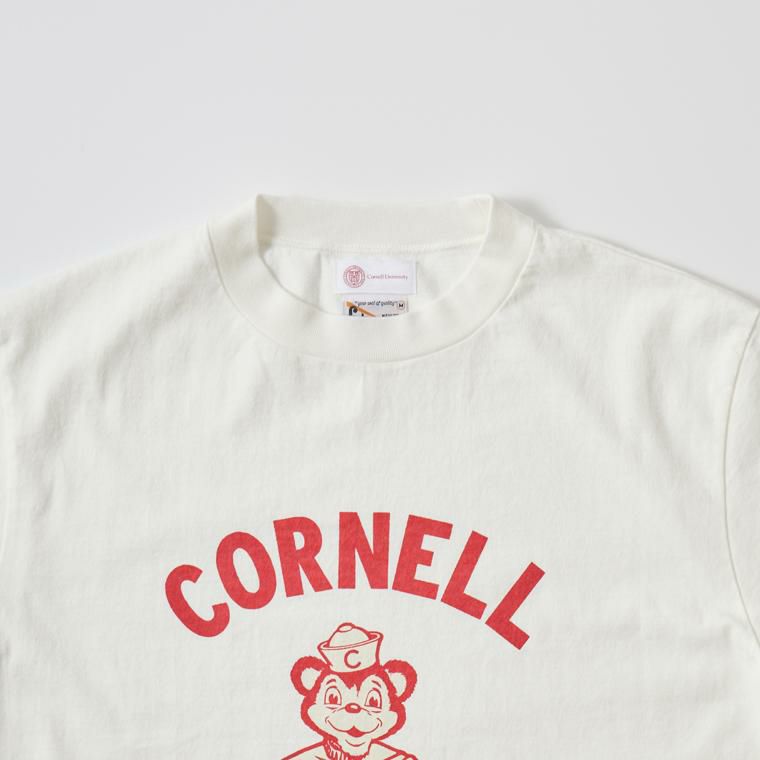 FELCO(フェルコ)のS/S HI CREW TEE CORNELL BEAR。U.S カレッジ公認のオリジナルコレクションアイテムとなるショートスリーブのプリントTシャツ。太めのネックリブで首元の詰まった、ハイクルーと言われるネック部分が特徴的なデザイン。ミドルウエイトのサラッとした着用感の良いコットン素材。左袖口のワッペンと左裾に付けられたオリジナルタグがちょっとしたアクセント。こちらはアイビーリーグでも名の知れたCornell University(コーネル大学)ロゴがプリントされたモデル。
