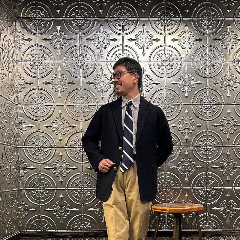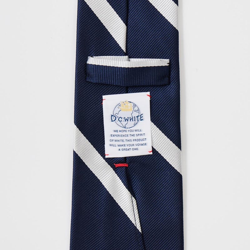 D.C. WHITE(ディーシーホワイト)のCLUB TIE REGIMENTAL。昔、イギリスでスカーフをネクタイにしていた縫製方法を現代的にアレンジし、剣先などのヘム部分をあえてミシンで叩きヴィンテージ感を出した独特な縫製仕様のネクタイ。大剣幅が8センチのスタンダードで使い勝手の良いサイズ。素材はシルクを使用。ツルッとした肌触りで光沢があり上品な雰囲気。レジメンタルは左上がりのアメリカ式。王道のアメリカントラッドブランドやイギリス、イタリアのタイブランドにはない隙間な一本。