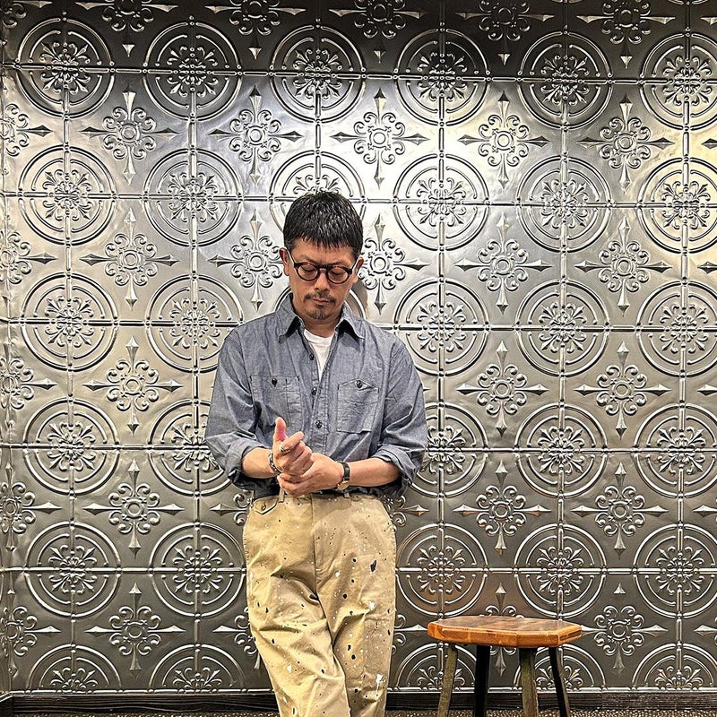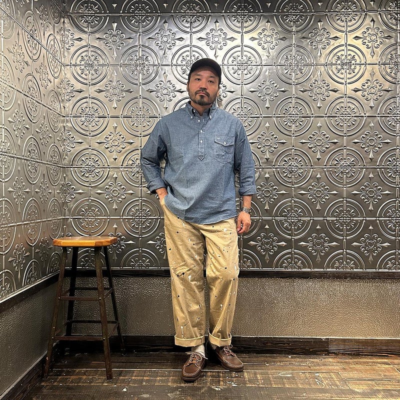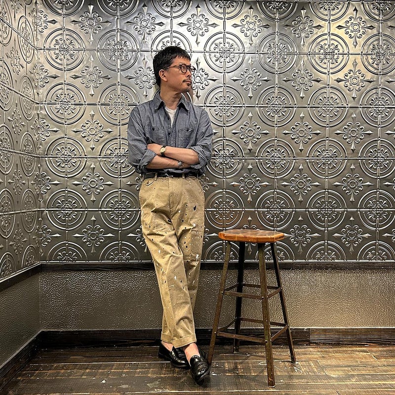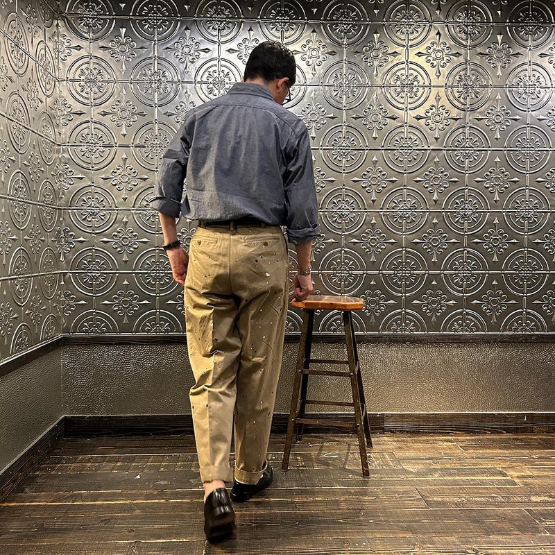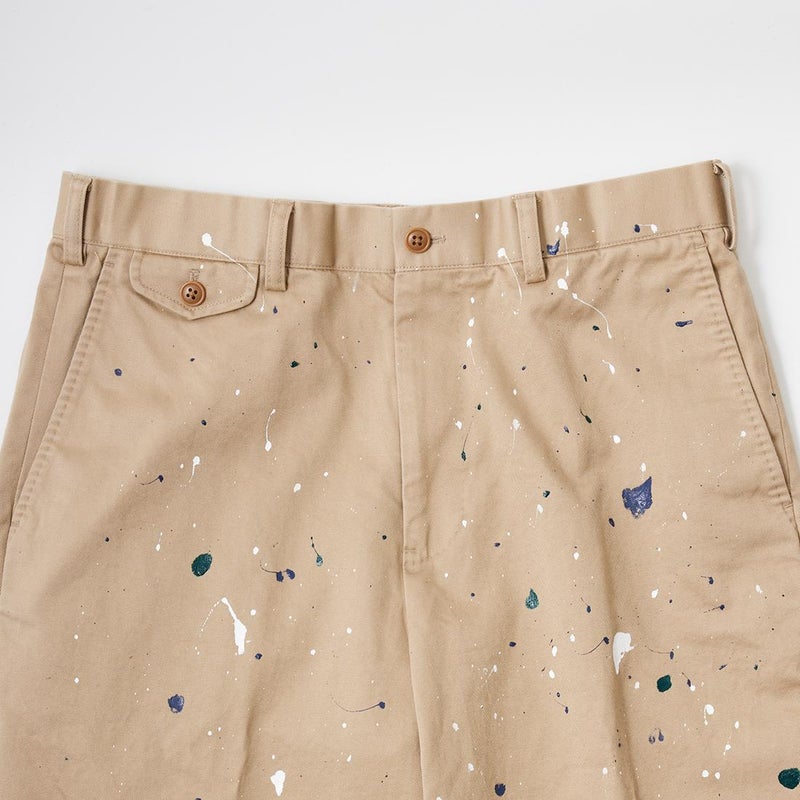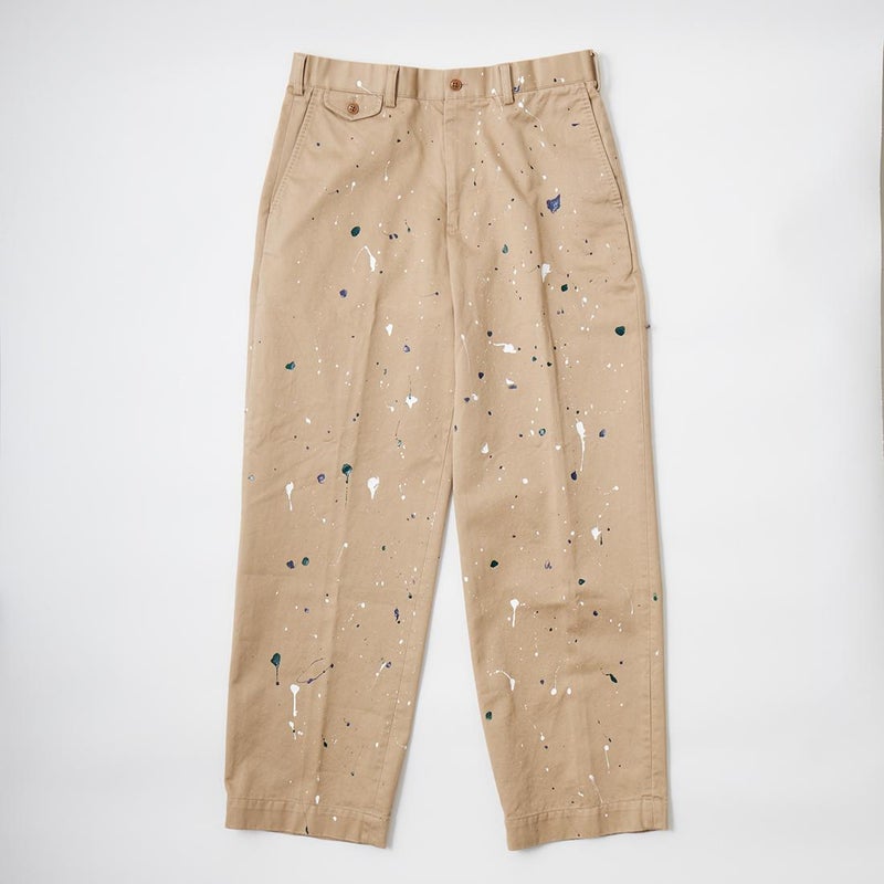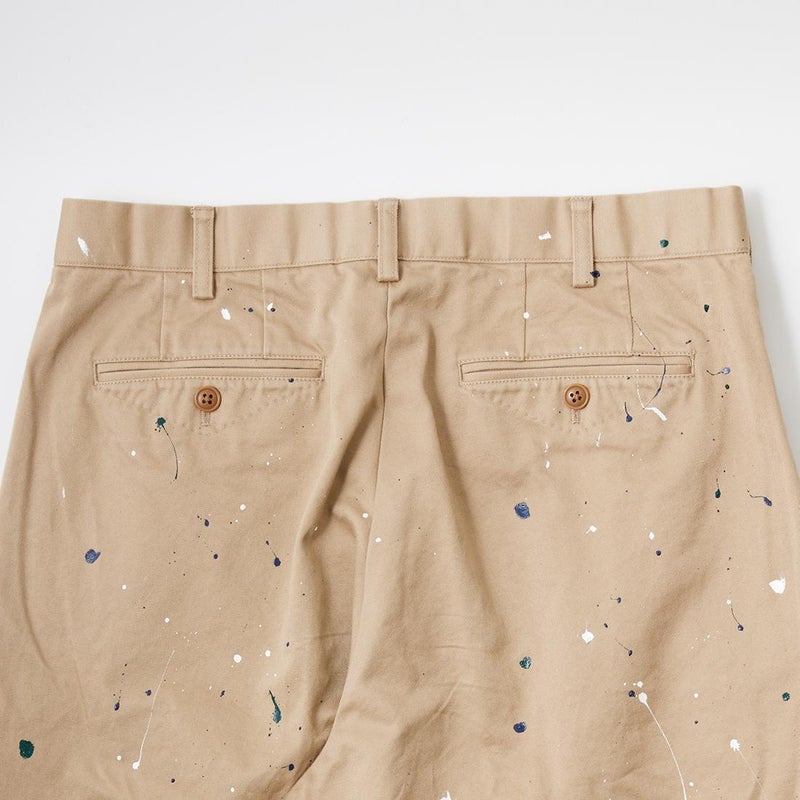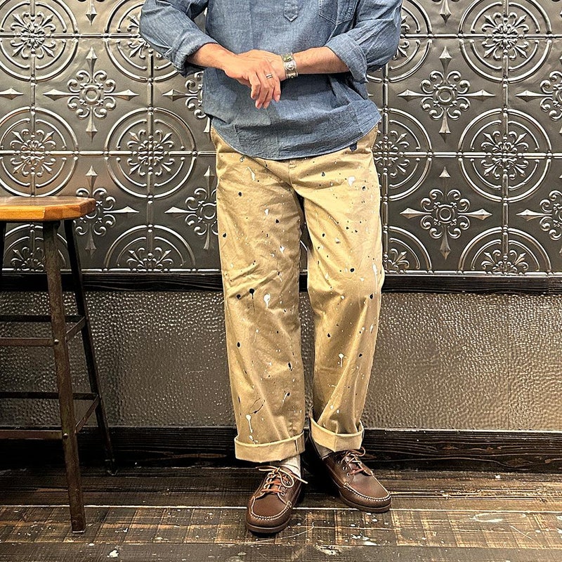 D.C. WHITE(ディーシーホワイト)のPAINTED WEST POINT OFFICER PANTS。デッドストックの通称「ウェポン(ウェストポイントチノクロス)」を使用したチノパンツ。ミリタリーチノでも、ドレスチノでもない、どちらの要素も兼ね備えたスタイリングの幅の広いリラックスフィットのチノパンツ。縫製仕様はウエスト部分にはフラップコインポケット、バックポケットは両玉縁仕上げというドレス仕立ての品のあるスラックス仕様。ペンキの色数をネイビー/グリーン/ホワイトの3色に抑え、ドリップを細かくして、上品な雰囲気に仕上げたペイントチノ。これまでペイントチノを経験されていない方にこそお試しいただきたい1本。