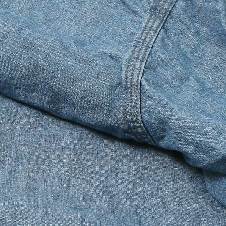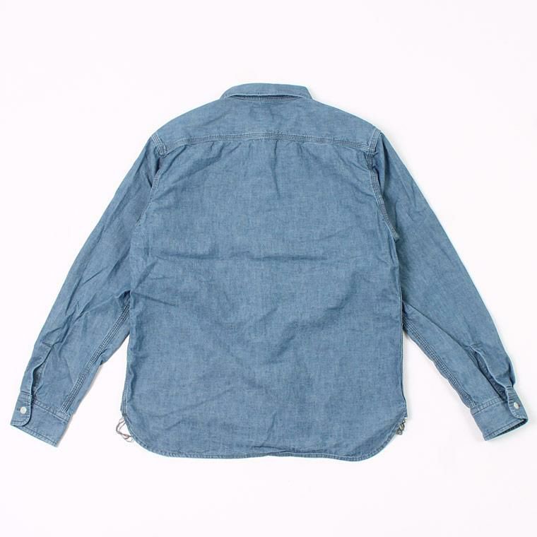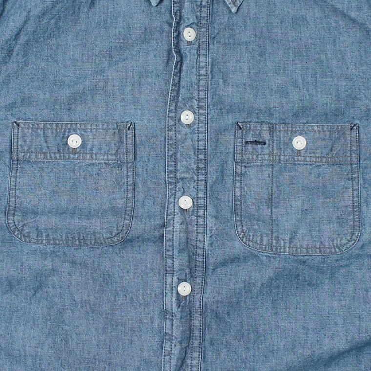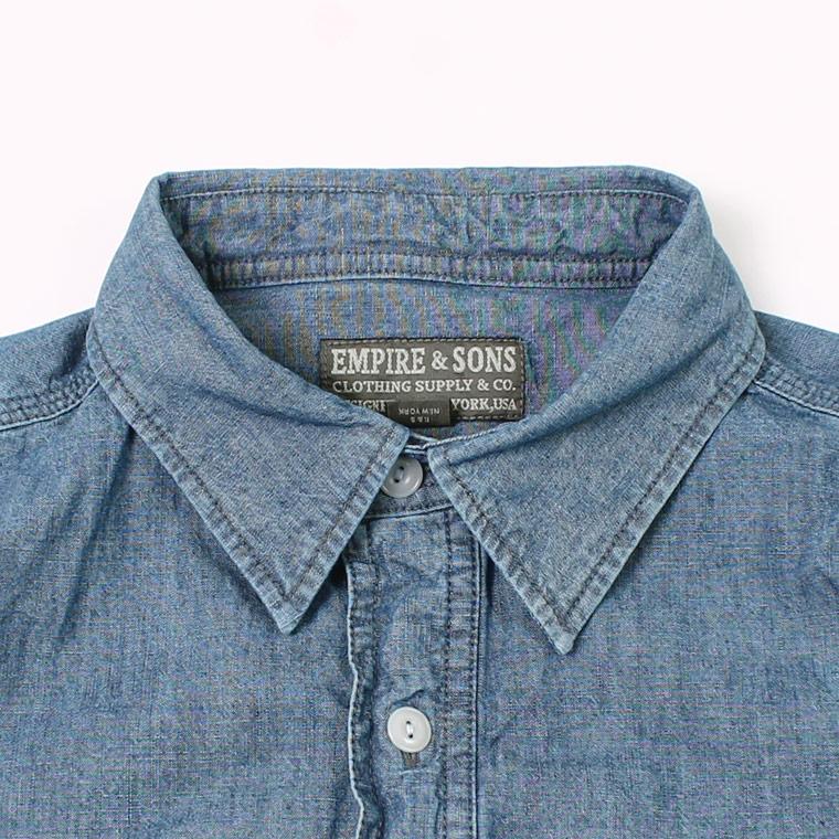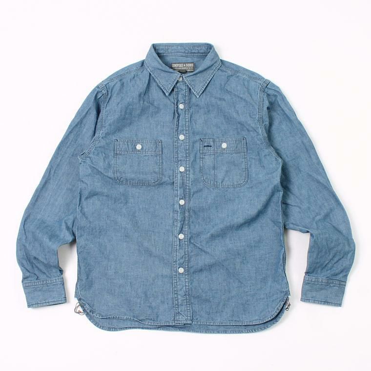 EMPIRE&SONS(エンパアアンドサンズ)のL/S WORK SHIRT 6oz AMERICAN SELVAGE CHAMBRAY MENPHIS BALL BIO WASH。硬すぎず柔らかすぎない程よいハリコシ感ののシャンブレー素材を使用したワークシャツ。やや小ぶりなサイズ感のレギュラーカラー、トリプルニードルによる縫製、空環仕上げなどこだわりの詰まったディテールのワークシャツです。両胸にはパッチポケット付き。ボールバイオ加工によりリアルな雰囲気の良いアタリが付いており、洗い込まれて柔らかくなった生地感もまた良い雰囲気。既に雰囲気のある1着ですが使い込むことで更なる経年変化も楽しんで頂けます。