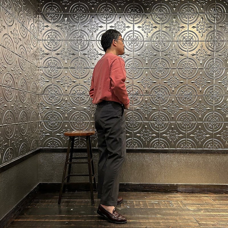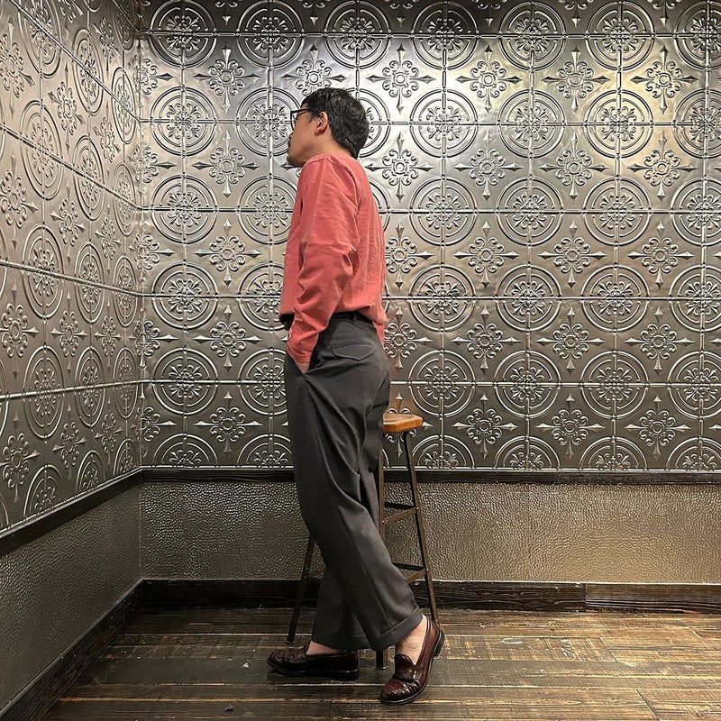 170センチ68キロの私の体型でMサイズでややゆとりのある個人的には丁度良い着用感です。このサイズであれば単品使いは勿論のこと、シャツ、ライトアウターのインナー使いとしても対応し易いサイズ感。それにスタイリングも。スポーティーから小綺麗なスタイリングまで幅広いスタイルで楽しめる着回しの良さ。それこそ普段穿くパンツのシルエットから考えると尚更丁度良いサイズ感だと思いましたね。軽めの生地感にややコシのあるタフで丈夫な素材を使用したシンプルなデザイン。こういうTシャツこそ何枚持っていても飽きないんですよね。