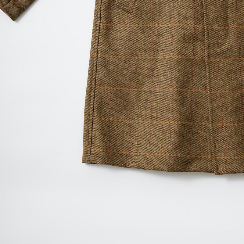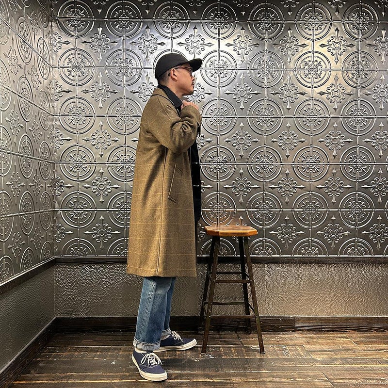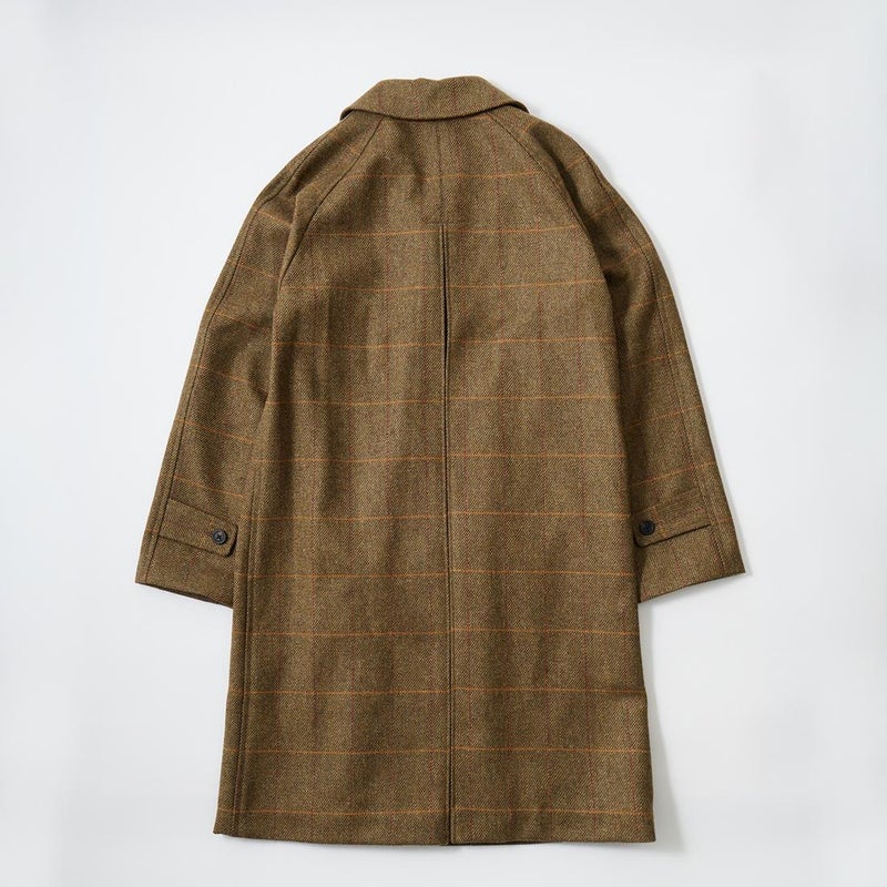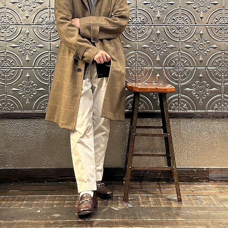 国内ブランドD.C. WHITE(ディーシーホワイト)のCAMBRIDGE。アメリカントラッドのルーツであるブリティッシュトラッドの象徴的な場所「ケンブリッジ」がイメージソースのコート。背面の深めのインバーテッドプリーツが特徴のAラインのコート。イギリス「DUGDALE BROS&Co」の目の詰まった重厚なツイード生地。ハリスツイードのフワッとした甘めな織りではなくガチガチな目の詰まった固めのツイード。現環境下で考えると今後はかなり希少な存在になる可能性がある英国ツイードを使って、日本国内のクロージング工場で縫製。スーツスタイルの上にもカジュアルスタイルの上にも羽織る事が可能な存在感のある一枚。