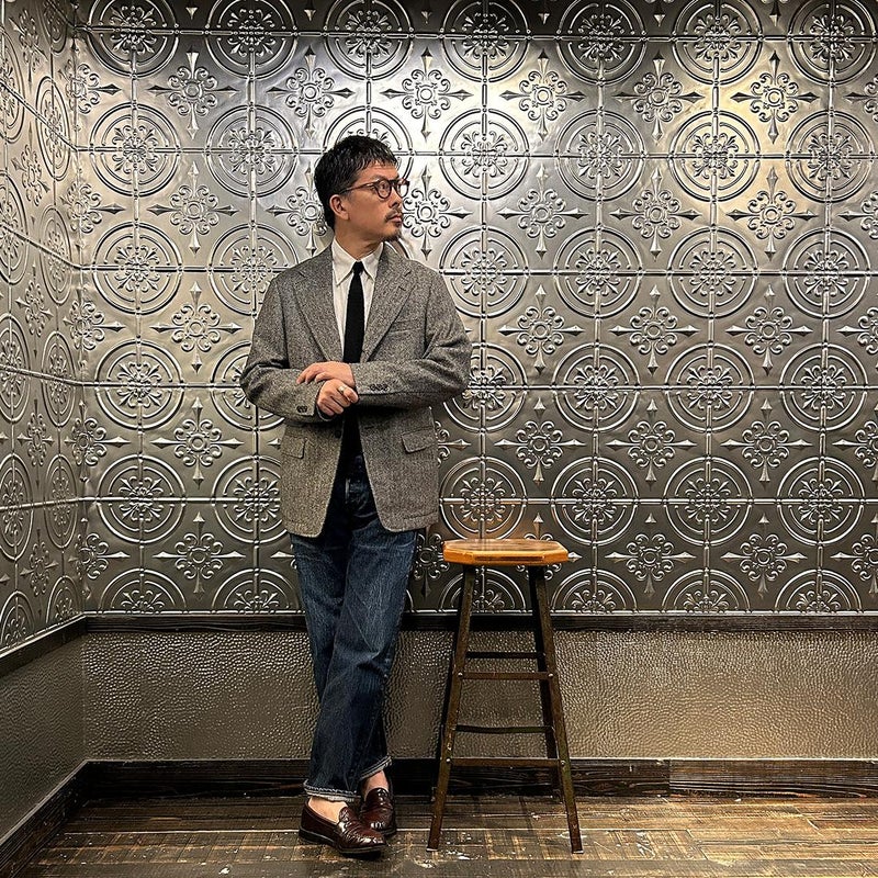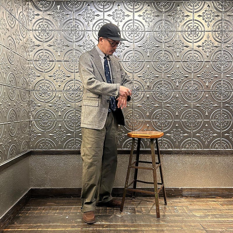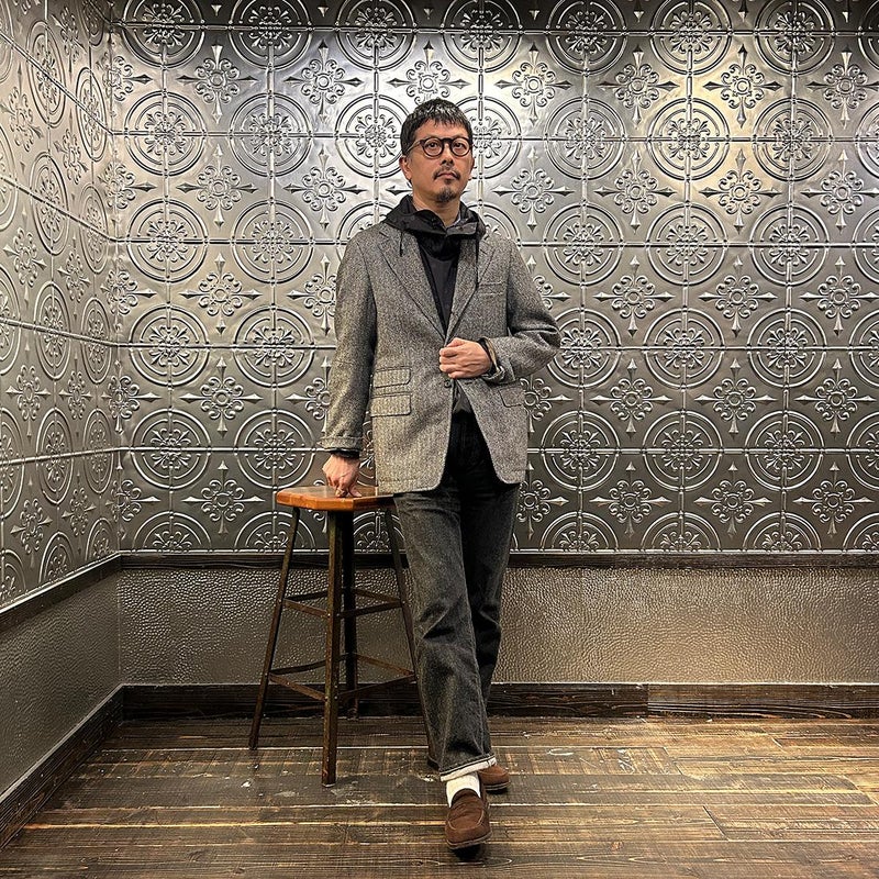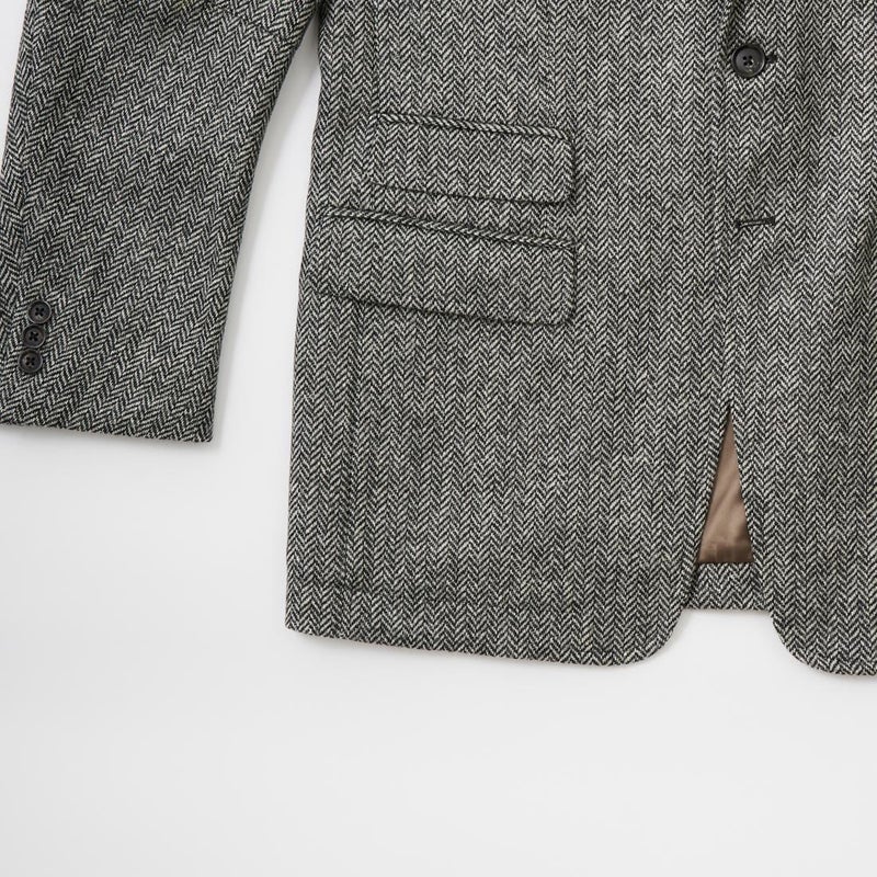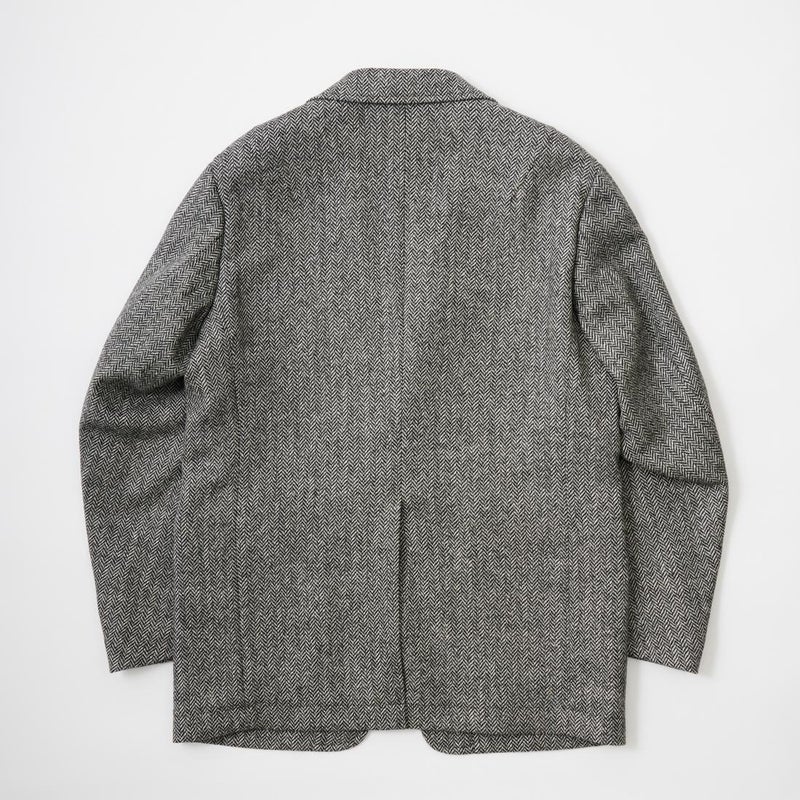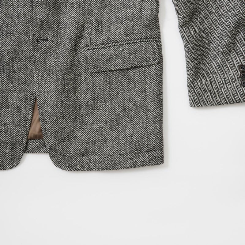 国内ブランド「D.C. WHITE」(ディーシーホワイト)のHACKING JACKET HERRINGBONE。英国乗馬の歴史と共に発達したスポーツディティールのツイードジャケット「ハッキングジャケット」がデザインソース。肩から肩甲骨に向かう部分、肘内側部分にはダーツを施し、シルエット以上にスポーツジャケットとしての広い可動域を確保。斜めになったスラントポケット仕様、チェンジポケット付きの英国ディテール。なだらかなラインを強調するラペルのロールやナチュラルなショルダーライン、質の高い仕立てをほのめかす首元に吸い付くような襟づくり、きつすぎないウエストシェイプなどD.C. WHITE(ディーシーホワイト)の拘りが詰まった完成度の高いジャケット。素材には180年以上の歴史を持つ英国 アブラハム・ムーン社のツイードクロスを使用。軽量かつ、綺麗な発色と柄が特徴。