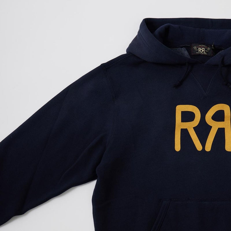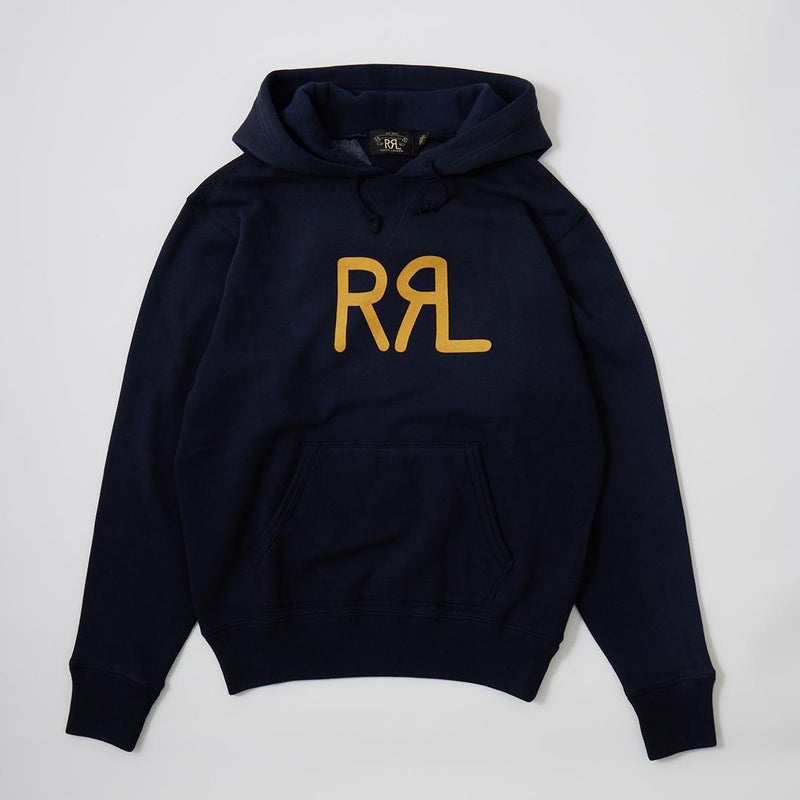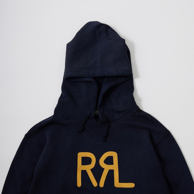 Double RL(ダブルアールエル)のPO HOOD LONG SLEEVE PULLOVER COTTON POLY FLEECE。Double RL Ranchのロゴがプリントされたフリースフーディ。ダブルVガセットをあしらったヴィンテージ感たっぷりのスウェットパーカー。フロントウエスト部分にはカンガルーポケットを装備。 ウォッシュ加工による着込んだ表情は雰囲気抜群の仕上がり。ネイビーボディーにイエロープリントの配色がアメリカンな雰囲気の1着。