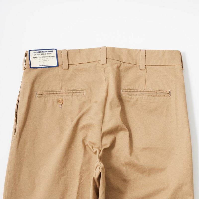 ALL AMERICAN KHAKIS(オールアメリカンカーキズ)のCRAMERTON TWILL RELAXED FIT。第二次大戦中のUSミリタリーチノの生地サプライヤーとして名を馳せた老舗テキスタイルメーカーCRAMERTON社の8.5ozツイルを使用したUS製チノパン。ハリコシのある中厚の8.5ozツイルは経年変化も楽しみな素材。前立てはジップフロント。左右にハンドポケット。バックの左右にも両玉縁ポケットを装備。深めの股上。ゆったりとした腰回りで膝下から緩やかにテーパードした穿き易いリラックスフィット。希少なアメリカ製もポイント。アイビーやトラッドスタイルだけでなく幅広いスタイリングに対応可能な1本。