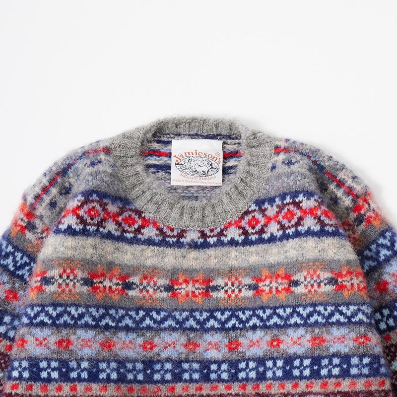 JAMIESON'S(ジャミーソンズ)のAOFI CREW NECK PULLOVER BRUSHED。クルーネックのフェアアイル柄のニット。スコットランド・シェットランド諸島産の上質な羊毛を植物染色し、色鮮やかな幾何学模様に編み立てたフェアアイルニット。 美しい発色とナチュラルな柔らかい風合い、軽くて暖かい着心地が特徴的なセーター。未だにアザミの棘で生地の表面を起毛する伝統的な手法を踏襲。通称シャギードッグセーター。フェアアイル柄のカラフルでパキッとした表情が起毛によって柔らかいボケた雰囲気に変化。柄物に苦手意識がる方でも取り入れやすいように別注しました。
