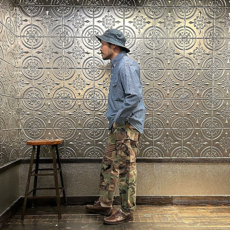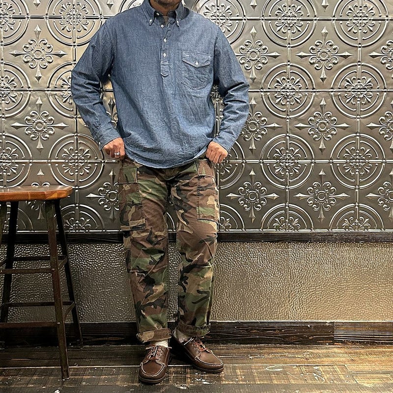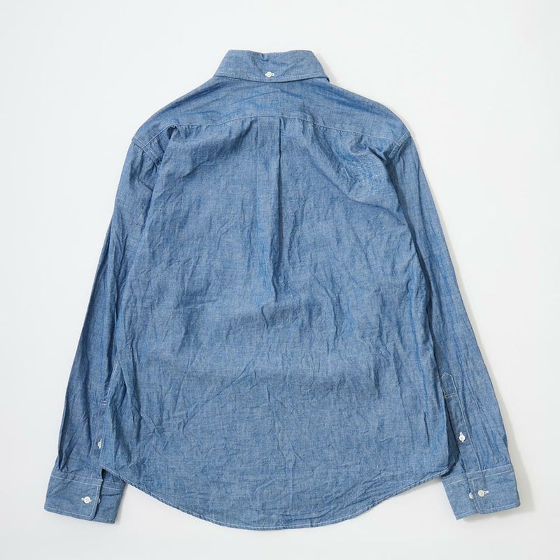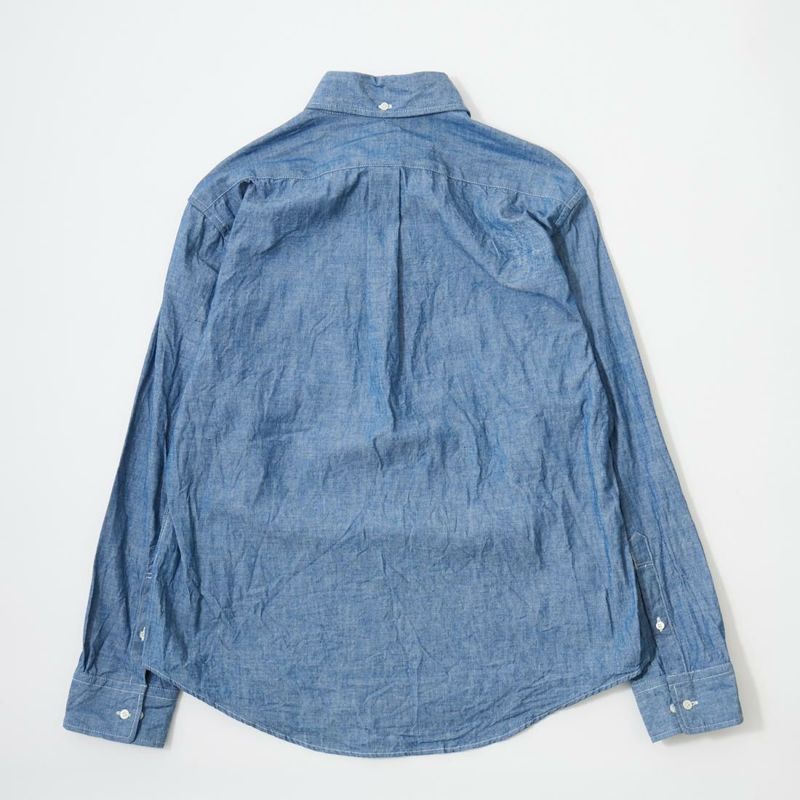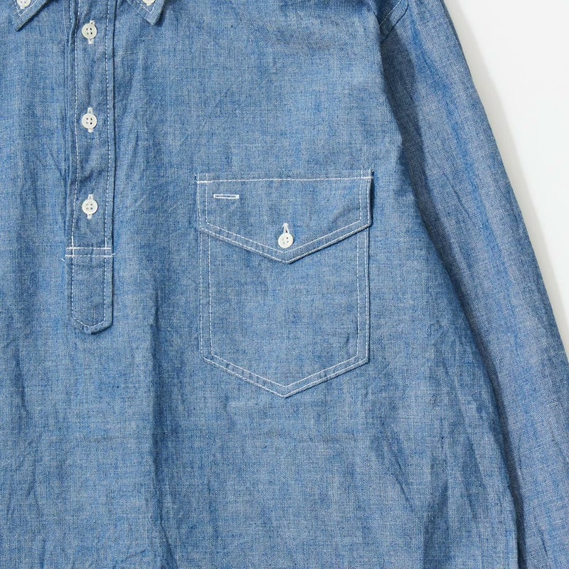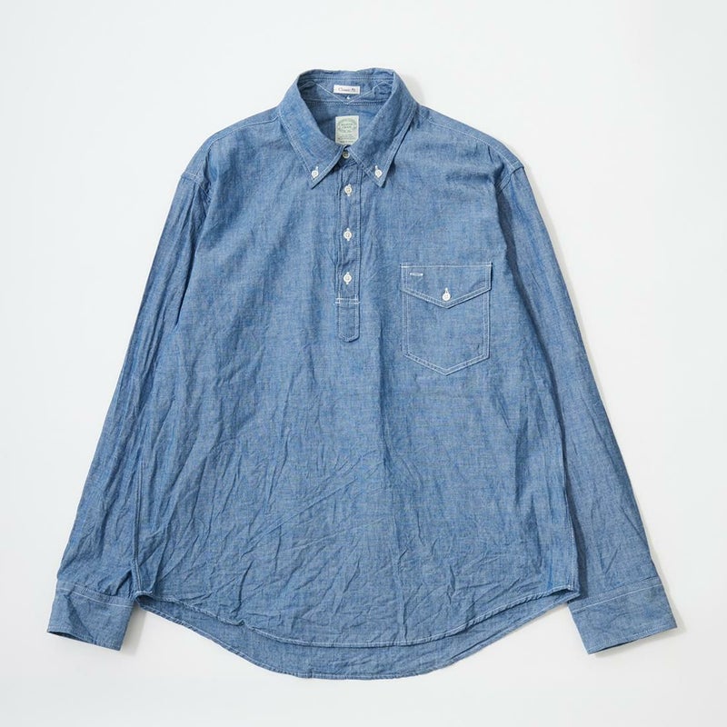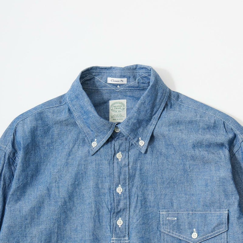 KEATON CHASE USA(キートンチェイスUSA)のL/S CLASSIC FIT PULLOVER BD SHIRT CHAMBRAY。日本生産ラインのプルオーバーの長袖ボタンダウンシャツ。ハリコシのある5オンスのコットンシャンブレーを使用。左胸にフラップ付きポケットが配置され、背面はボックスプリーツ仕様。アメリカブランドのシャツらしいチョークボタン付き。シルエットは全体的にゆとりのあるクラシックフィット。シャンブレーのカジュアル感が良い雰囲気。