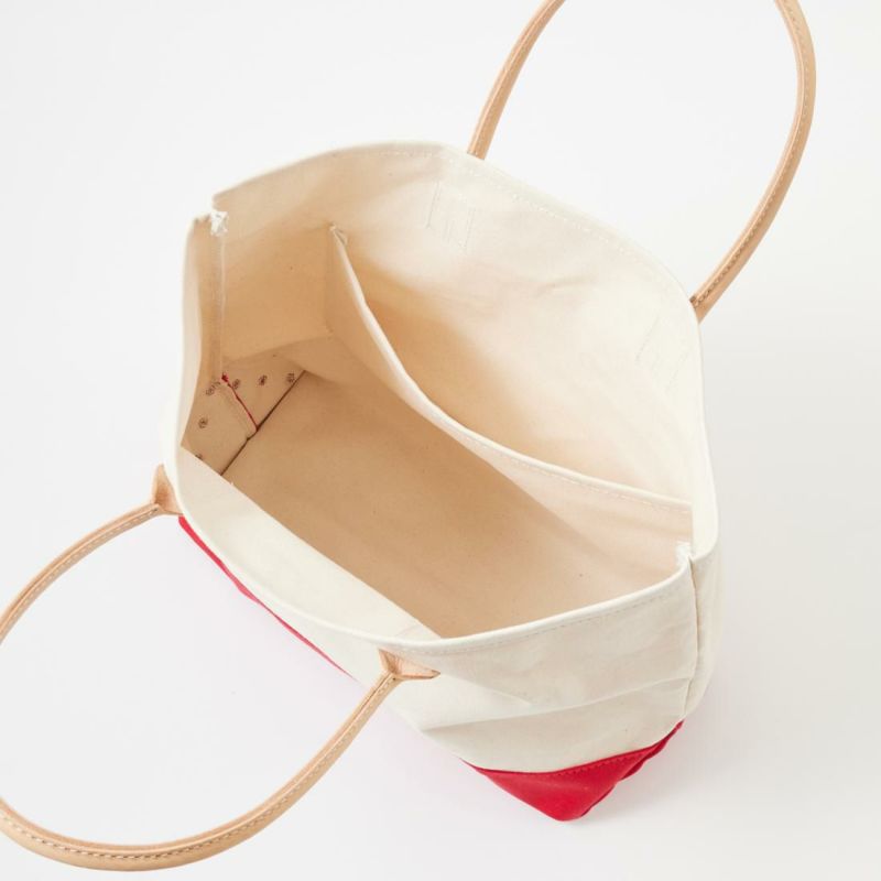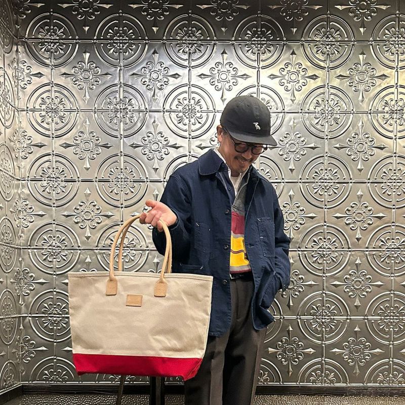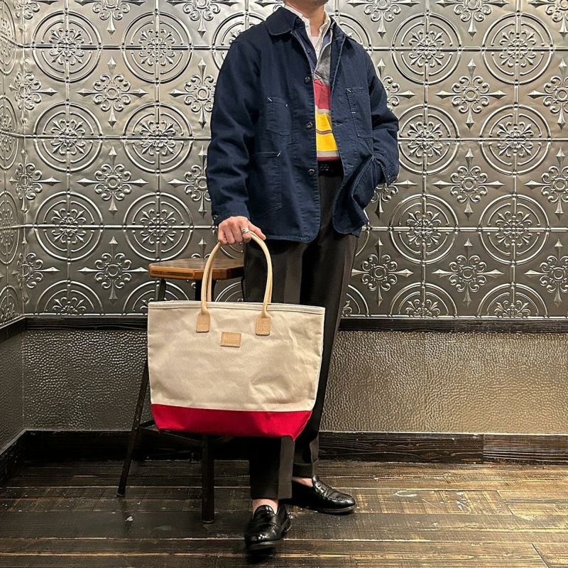HERITAGE LEATHER(ヘリテージレザー)のCANVAS BOTTOM DAY TOTE 。18オンスのコットンキャンバスダックをボディに使用したトートバック。ハンドル部分は植物タンニンなめしの天然皮革。旅行などにも対応可能な大容量のトートバック。小物の収納に最適なインナーポケットも装備。キャンバスやレザー部分の経年変化も楽しみな1品。