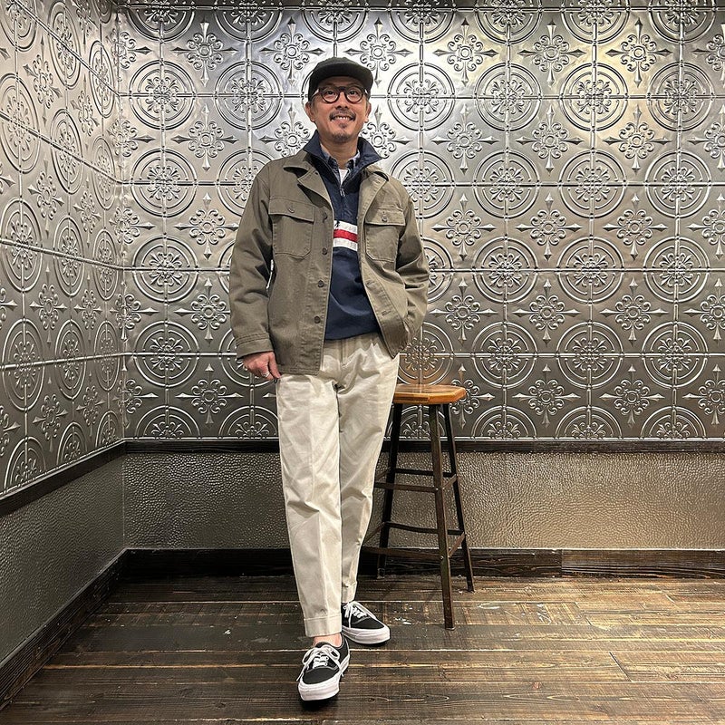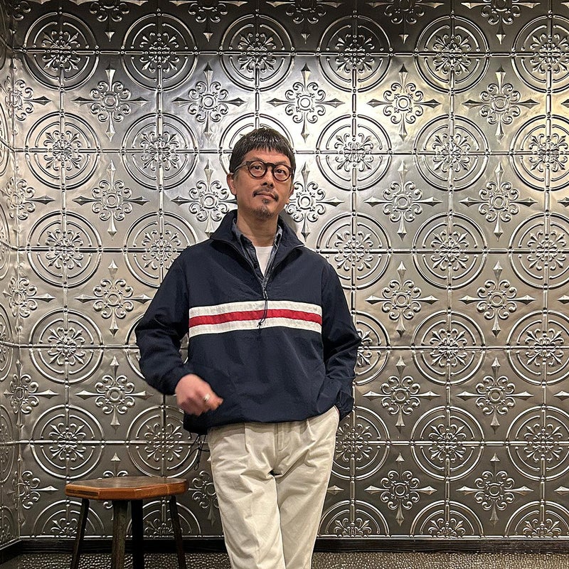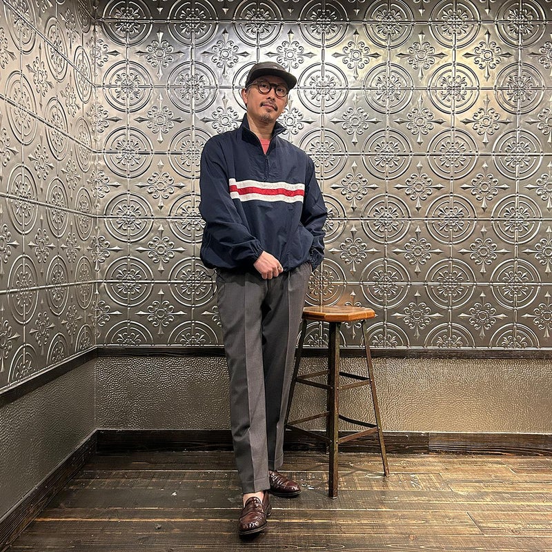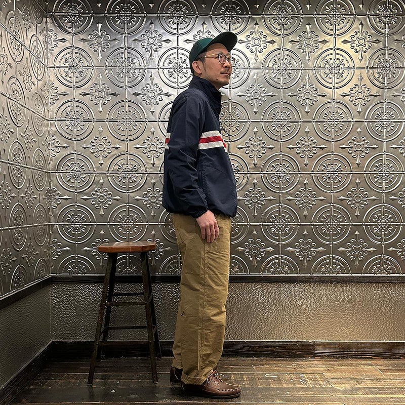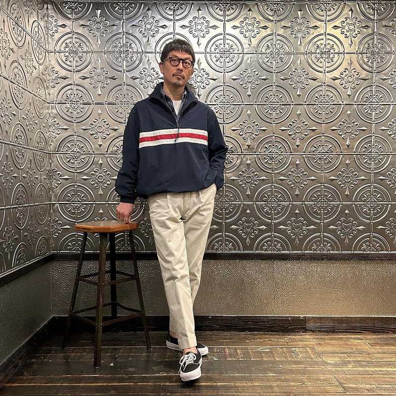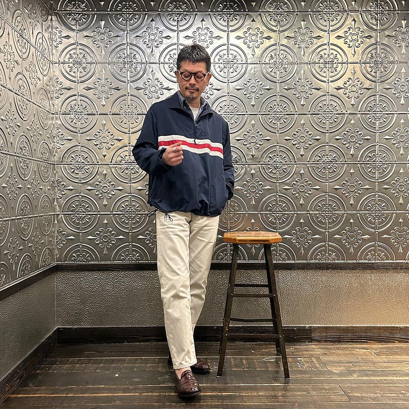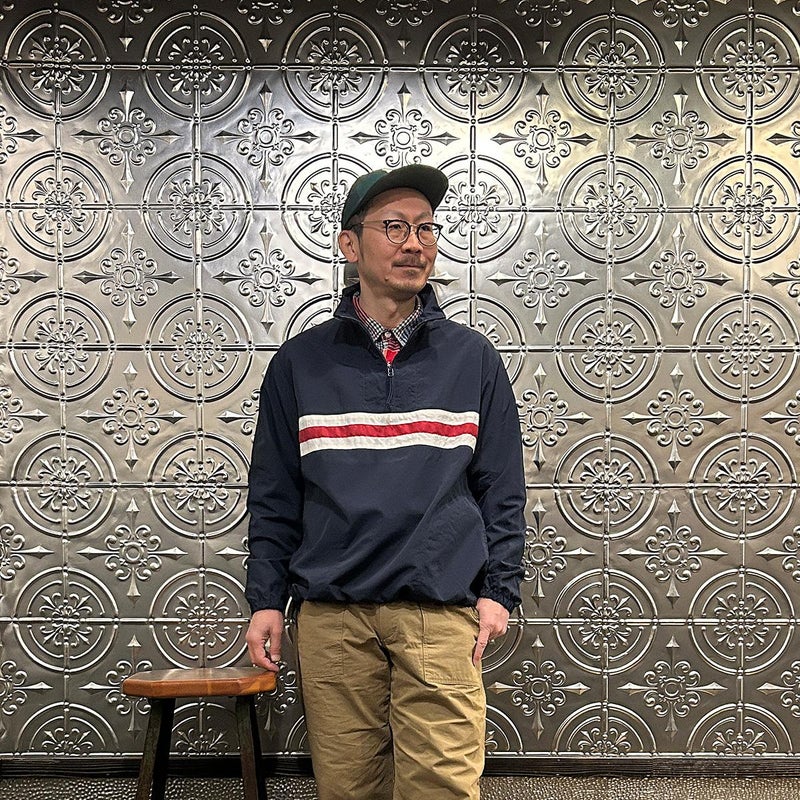 172センチ60キロでサイズは「S」でゆったり目のサイズ感です。中にそれなりに着込む事もできます。プルオーバー仕様である点、気分的にも少しゆったり目に着たいので選ぶサイズとしては「S」が適正だと思っています。いい意味でのチープレトロな雰囲気を持ったナイロンジャケット。昔っぽいんですが、サイジングや全体の雰囲気が今っぽいのが凄い所。個人的にはジャケットやコートの中に着こむミドルレヤーとしての用途がオススメ。春以降は単体での着用でもカッコイイですし、ショーツとの合わせも良いですよね~。持っていると凄く重宝する一枚だと思います。