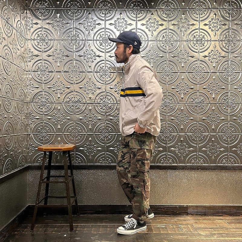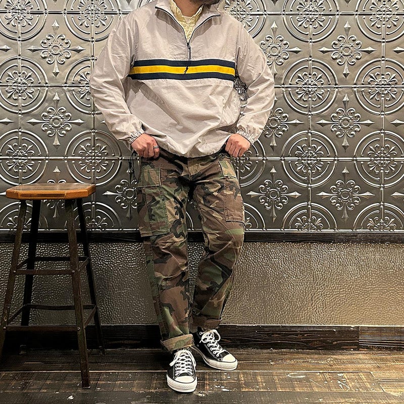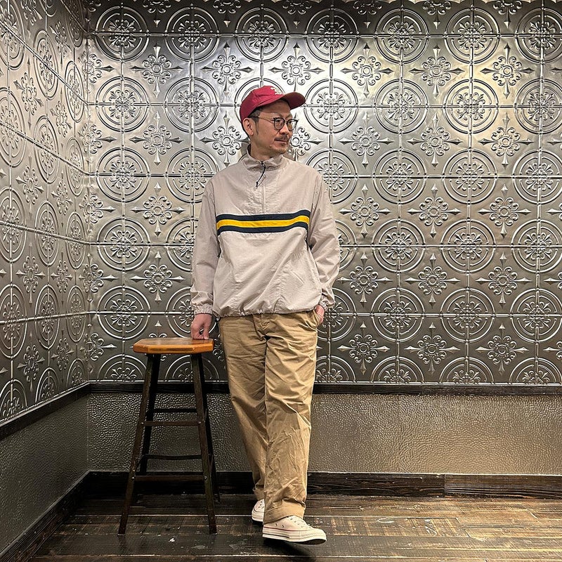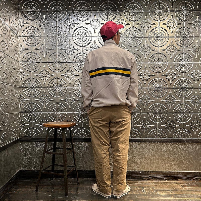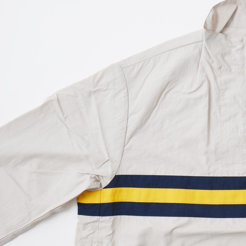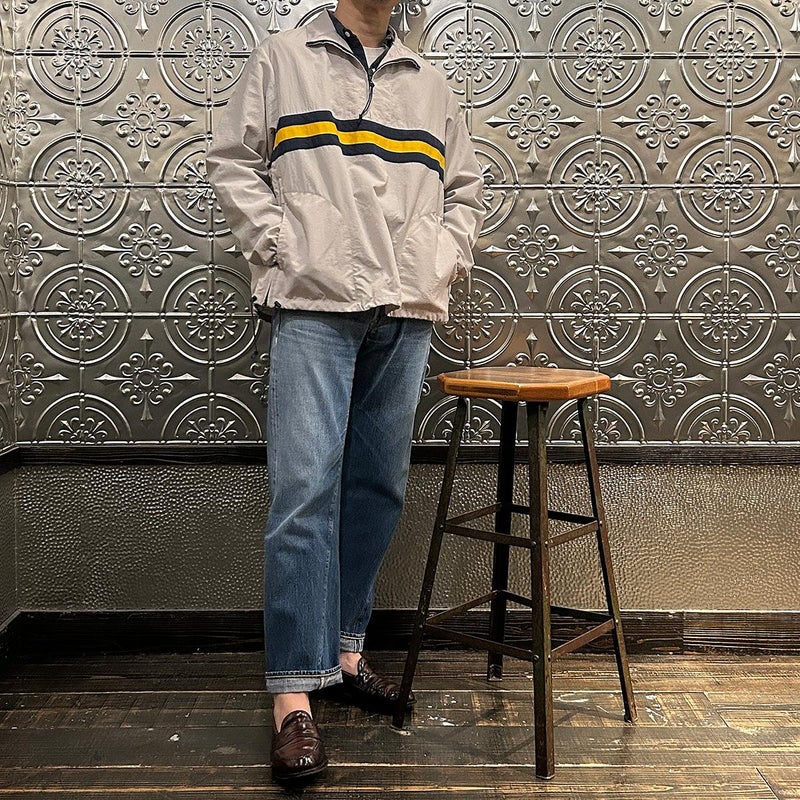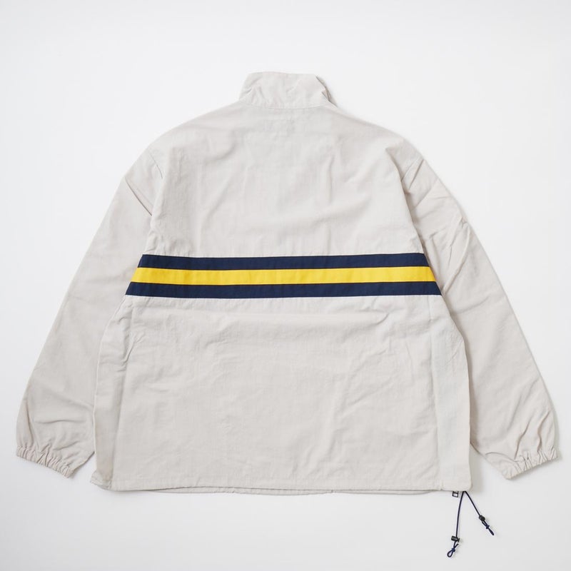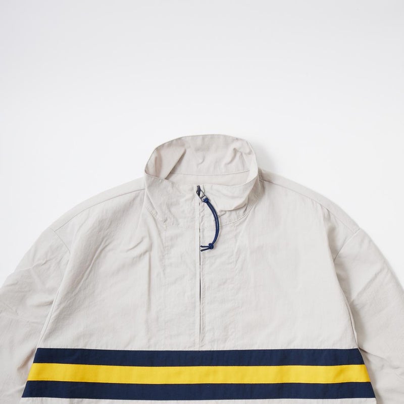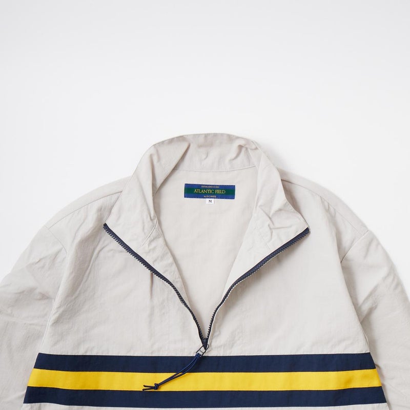 D.C. WHITE(ディーシーホワイト)のTRAINING BLOUSON。1960年代のアイビーリーグ大学生協ストアで販売されていたプロダクトを現代的に解釈したコレクション「ATLANTIC FIELD BY D.C.WHITE」。「テイクアイビー」で撮られた60年代のアイビーリーガーらが着用していたアノラックパーカーがデザインソースのスポーティなプルオーバージャケット。ハーフジップ仕様の低めのスタンドカラー。腰にはハンドポケット。右脇部分にはジップが装備されており着脱し易い仕様に。裾にドローコードが装備されておりシルエットアレンジが可能。素材は軽量で耐久性、速乾性、微撥水性をもつナイロンタスラン生地を採用。機能性も高い1着。