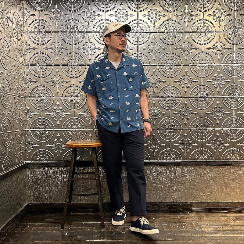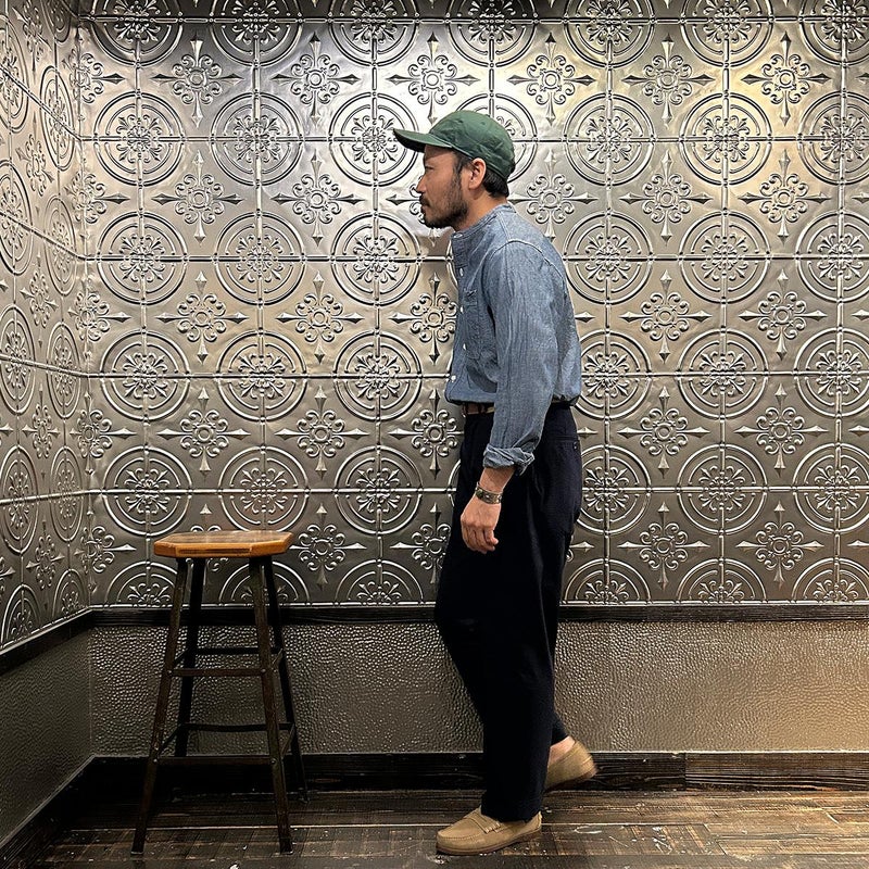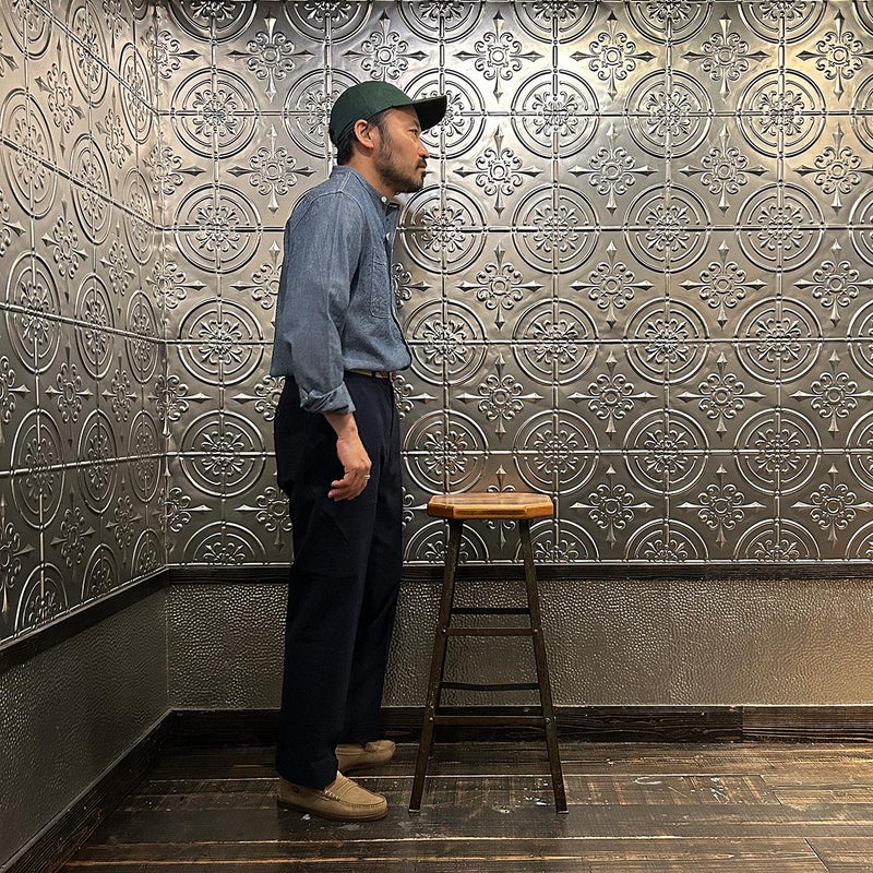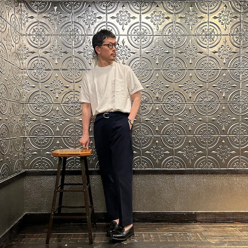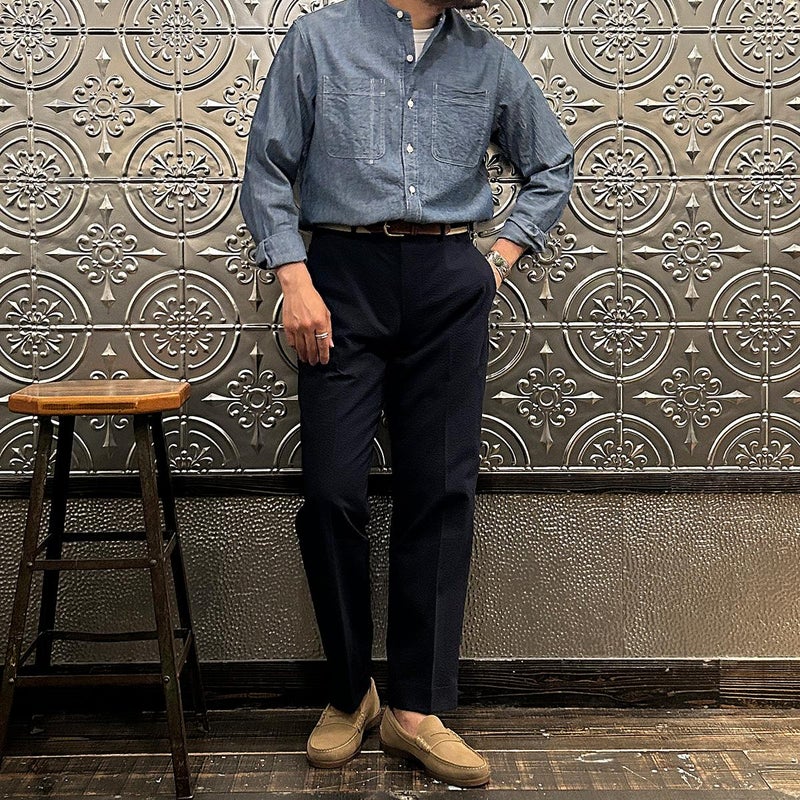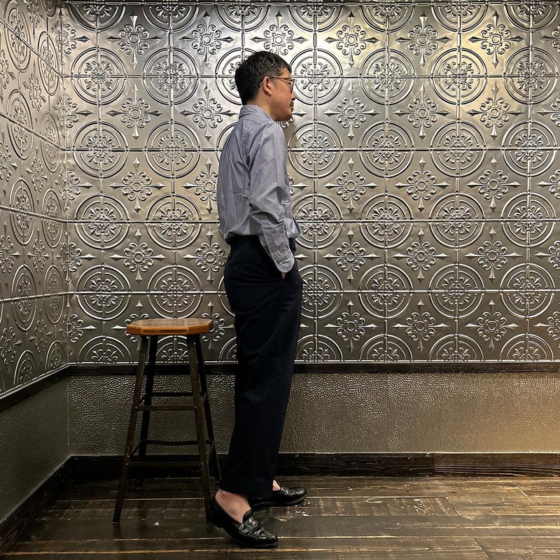 172センチ60キロで「46」でウェストに少しゆとりのあるサイズ感です。普段は30インチを基準にパンツを穿いています。「44」でも穿けるのですがシルエット的に「46」ぐらいの方が好みだったので自分が穿くのであれば「46」を選びます。背面の尾錠を締めればウェストが少し緩くてもお尻の上部分で引っかかる感覚で特に問題はありません。同ブランドの定番のアメリカントラウザーは直線と曲線のバランスが非常に良いパンツ。いい意味での大量生産時代のアメリカのトラウザーズのイメージでしょうか。夏にも快適に穿ける天然の機能素材「シアサッカー」をお楽しみください