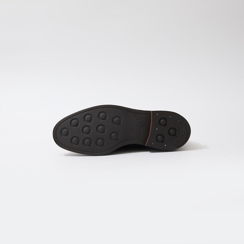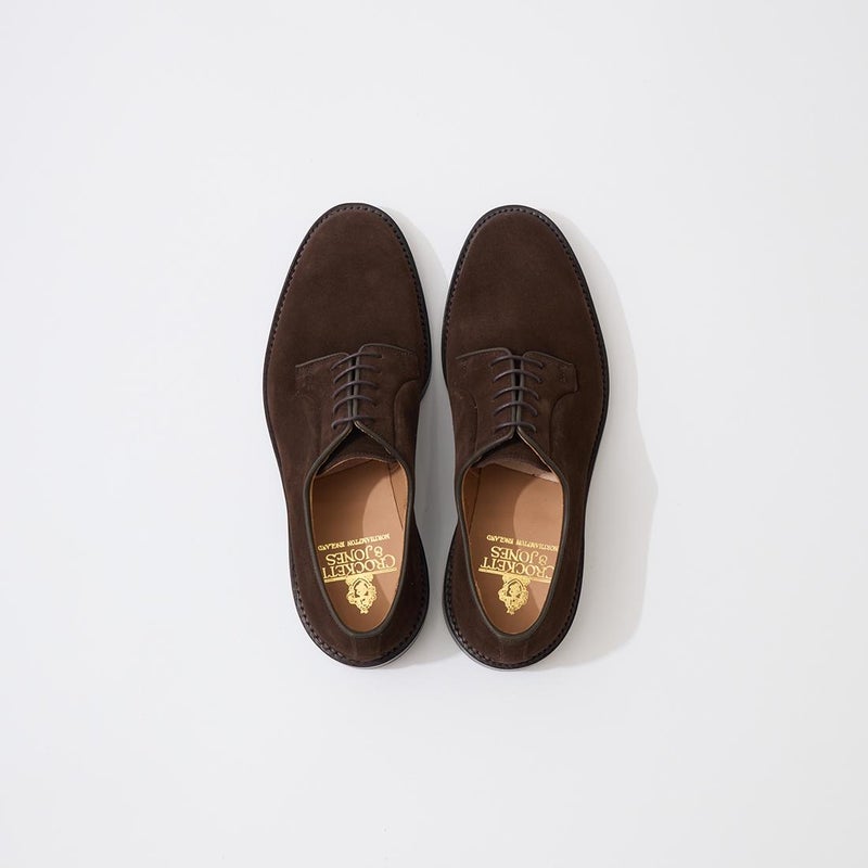 イギリス発「CROCKET&JONES(クロケットアンドジョーンズ)」のLANARK 3 Dainite Sole。シンプルなプレーントゥダービーシューズ。外羽根の取り付けにはステッチが表に出ないブラインドシームを施してパーツやステッチの主張を最小限に抑えた仕上がり。ボリュームのあるラウンドトゥを持つ【ラスト378】は、足幅の広い方にも適した設計で、前足部にゆとりを持たせつつ、バックパートにはしっかりフィットする新設計のヒールカップを採用。ソールは英国 Harboro Rubber Company のダイナイトスタッズソールをストームウエルトと組み合わせることでソール周りに重厚感を演出。アッパーには柔らかな印象を持つ上質なスエード素材を採用。なめし工程で防水加工が施され、高いレベルの耐水性を確保。クラシックなシルエットながらも様々なスタイル、シーンに適用できる1足。