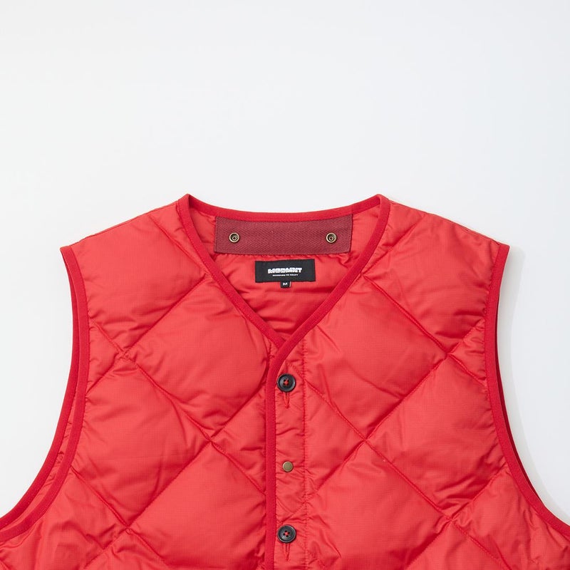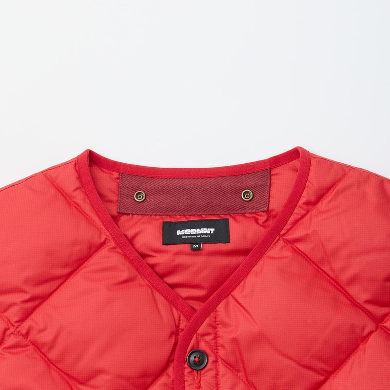 MODMNT(モドメント)のLINER DOWN VEST。表地に高密度に織り上げたマイクロファイバータフタを使用したライナーダウンベスト。インナーを選ばない開き具合のネックライン。ボタンとスナップが交互に配置された前立て。腰部分にはジップポケットを装備。スペイン産ホワイトダウン(国内洗浄)を40g封入。ダウン90%・フェザー10%の混紡で軽快さと快適性を両立。表地に撥水加工が施された機能性も高い1着。
