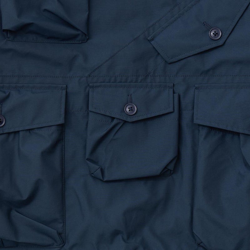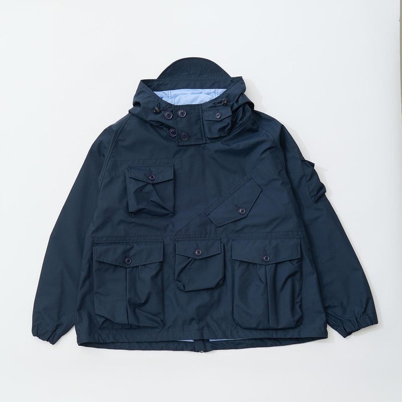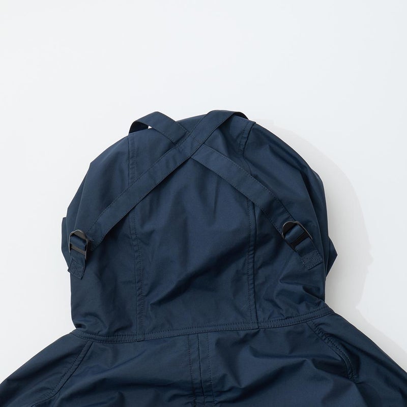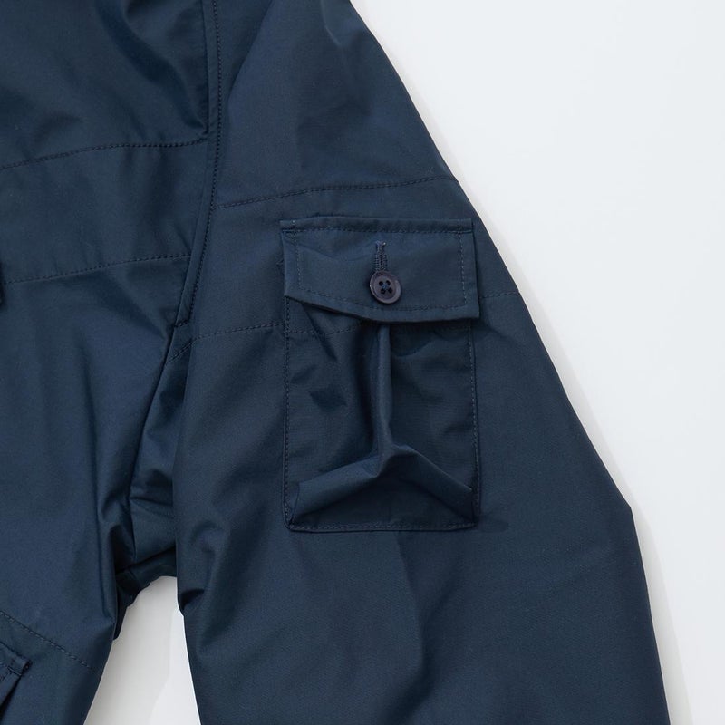 MODMNT(モドメント)のMIL SMOCK SHORT。英軍ロイヤルネイビーのヴェンタイルスモックがデザインソースのジャケット。フィッシング用のジャケットの要素を融合したデザイン。口元まで被る高めの襟。フロントにランダムに配置された多数のポケット。後ろの裾近くにもポケットを装備。バック中央に配置されたジップもポイント。防水性・透湿性を兼ね備えた3層素材を採用。耐水圧11,000mm・透湿度8,500g/m2/24hrという高いスペックのナイロン素材。機能性も高い1着。