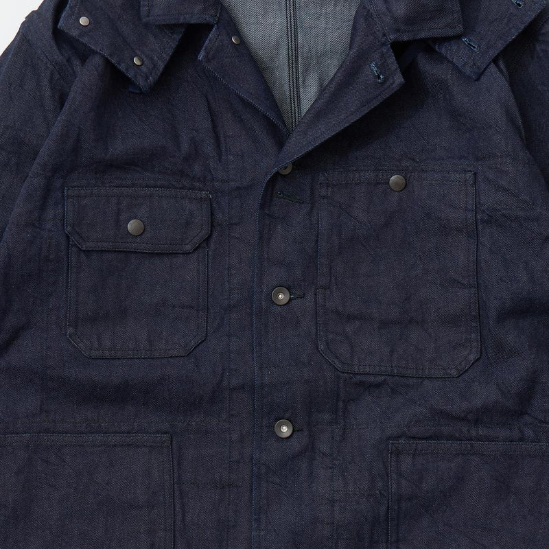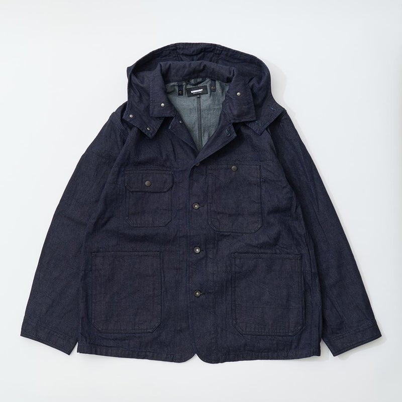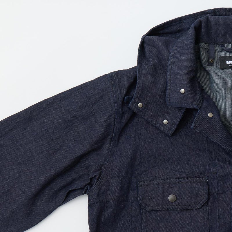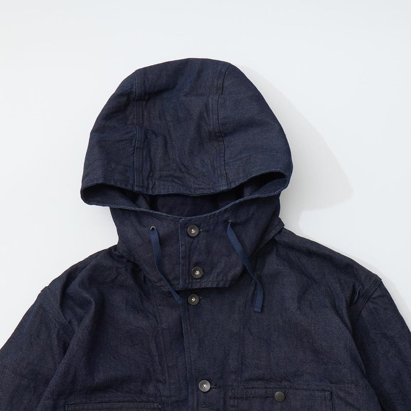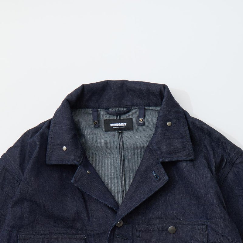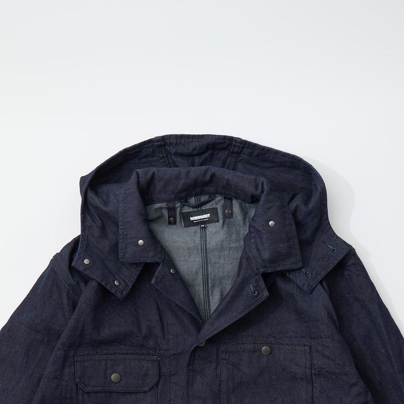 MODMNT(モドメント)のCOVERALL JACKET。10ozのムラ糸デニムを使用したカバーオールジャケット。取り外し可能なデタッチャブルフード。首元にチンストラップ。前身頃と後見頃に配置された多数のポケット。前立てはボタンフロントでドーナツボタンを使用。素材は染めは広島・福山、織りと仕上げは岡山・井原で行われた日本製デニムを使用。