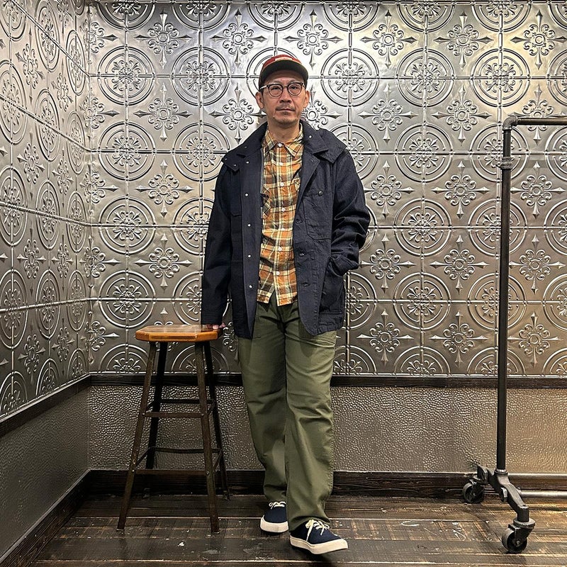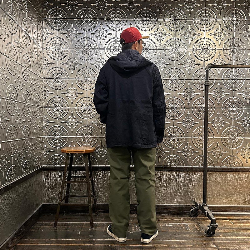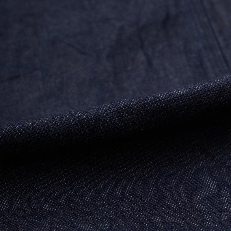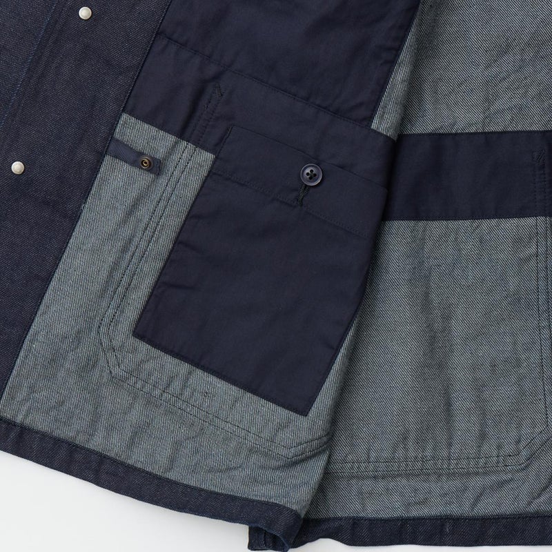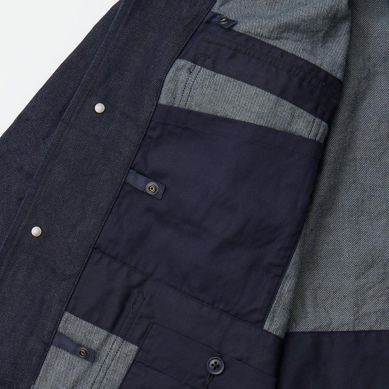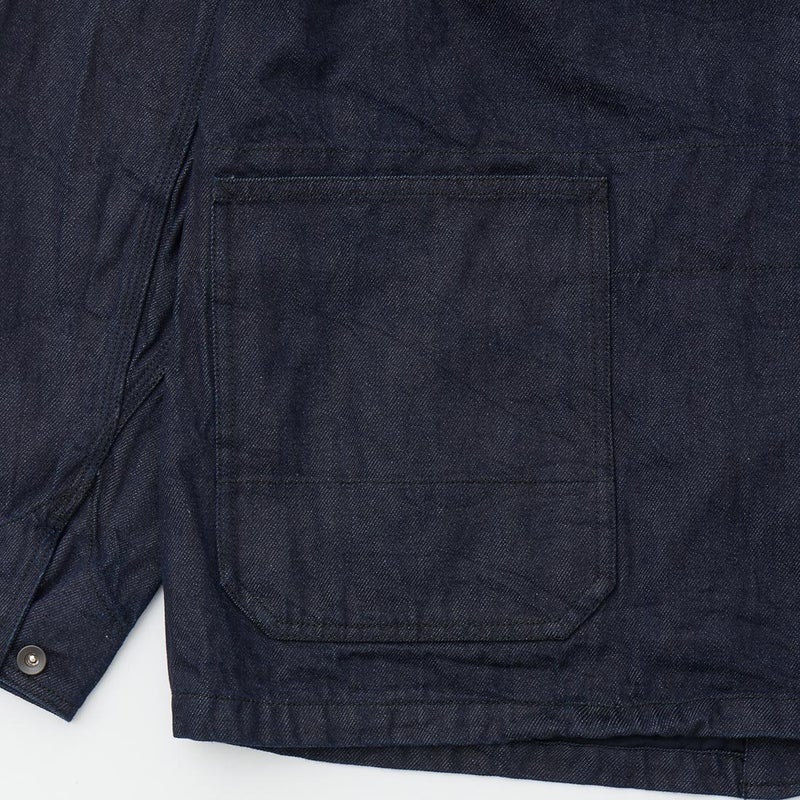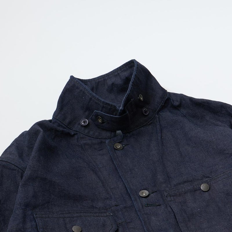 MODMNT(モドメント)のCOVERALL JACKET。10ozのムラ糸デニムを使用したカバーオールジャケット。取り外し可能なデタッチャブルフード。首元にチンストラップ。前身頃と後見頃に配置された多数のポケット。前立てはボタンフロントでドーナツボタンを使用。素材は染めは広島・福山、織りと仕上げは岡山・井原で行われた日本製デニムを使用。
